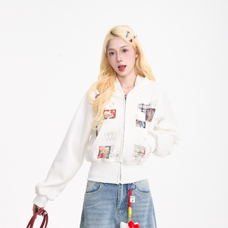 淘宝NERESUM趣味Kitty猫贴纸印花开衫卫衣女美式甜酷百搭连帽短款外套
