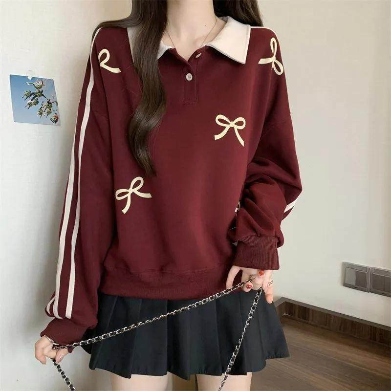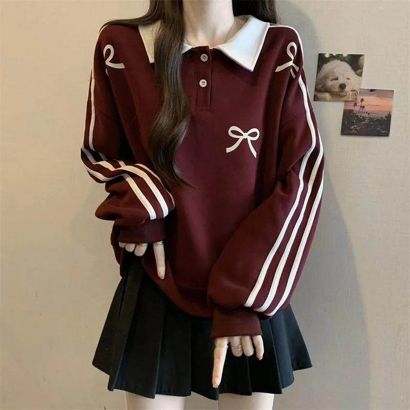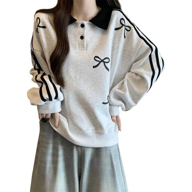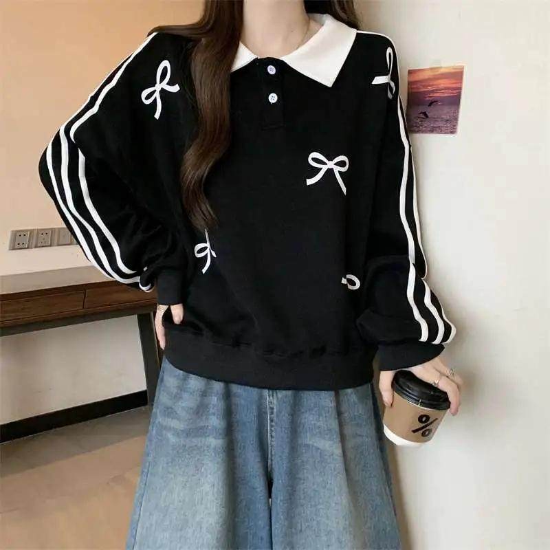 淘宝大码2-300斤条纹三条杠polo领卫衣女春秋宽松胖mm蝴蝶结上衣外套
