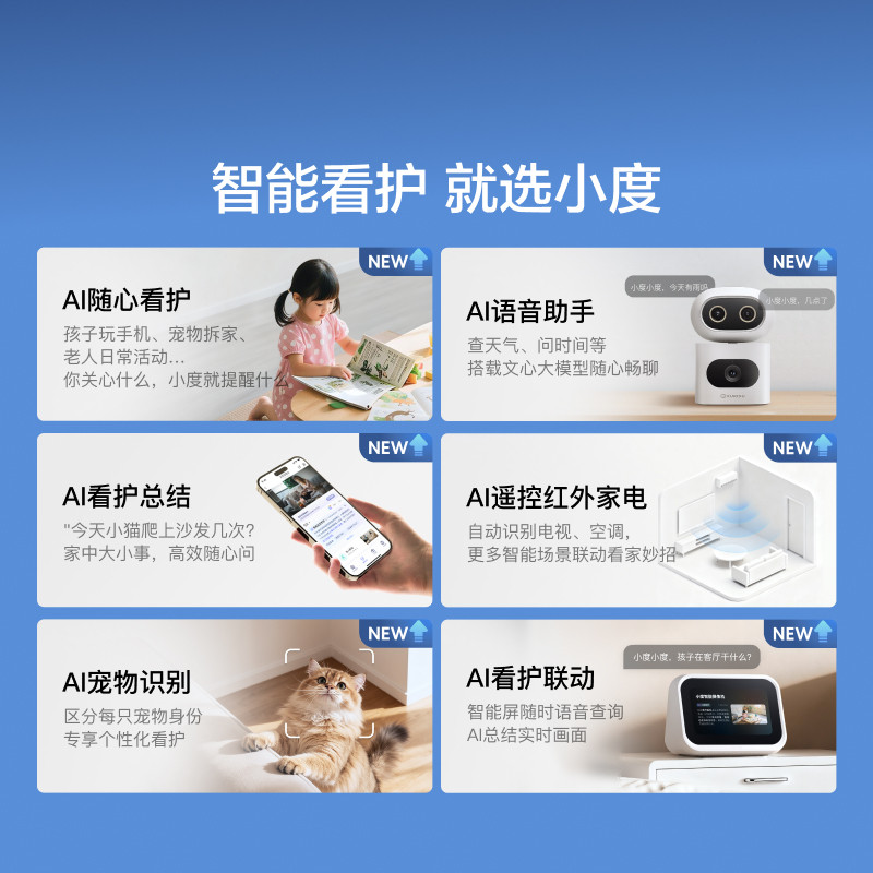小度智能摄像机C1200三摄版是一款专为家庭安防设计的高端无线室内监控设备。配备三颗摄像头,支持多视角覆盖与智能变焦功能,可清晰捕捉家中各个角落的动态。搭载高清夜视与AI人形侦测技术,有效减少误报,提升安全预警准确性。用户可通过手机APP远程实时查看、双向语音通话,并支持云存储与本地存储,保障录像安全。设备安装简便,支持Wi-Fi连接,适配多种家居环境。无论是看护老人、孩子,还是监控宠物与财产安全,小度C1200三摄版都能提供全天候、智能化的守护体验,是智慧家庭安防的理想选择。
