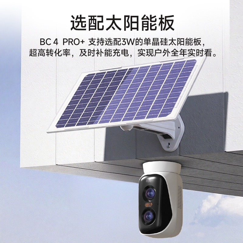 神眸BC4Pro+是一款创新太阳能智能监控设备,搭载双目800W高清摄像头,支持360度全景可视,实现无死角监控。采用高效太阳能供电系统,免插电设计,安装便捷,环保节能。内置4G模块,无需Wi-Fi和外部电源,真正实现免流量、免布线,适用于庭院、农场、工地等偏远场景。具备IP66防水等级,全天候稳定运行,支持移动侦测、夜视全彩、手机远程实时查看与回放功能。AI人形识别有效降低误报,保障安全更智能。神眸BC4Pro+以卓越性能与极简部署,为用户打造高效、省心、全天候的智能安防解决方案。