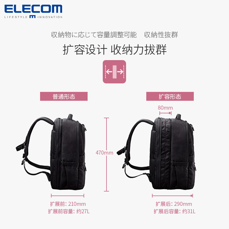 ELECOM多功能双肩包是一款专为出差与旅行设计的大容量背包,采用可扩容设计,满足不同场景下的收纳需求。包体结构科学分区,主仓可容纳衣物、书籍等日常用品,前置多功能收纳袋便于存放小物件。特别配备独立15.6英寸电脑隔层,加厚防震设计,有效保护笔记本安全。背负系统符合人体工学,宽厚肩带与透气背垫减轻肩部压力,长时间背负更舒适。材质防水耐磨,结实耐用,适合商务出行、短途旅行或日常通勤。简约大气的外观设计,男女皆宜,兼顾实用与时尚,是现代都市人群的理想出行伴侣。