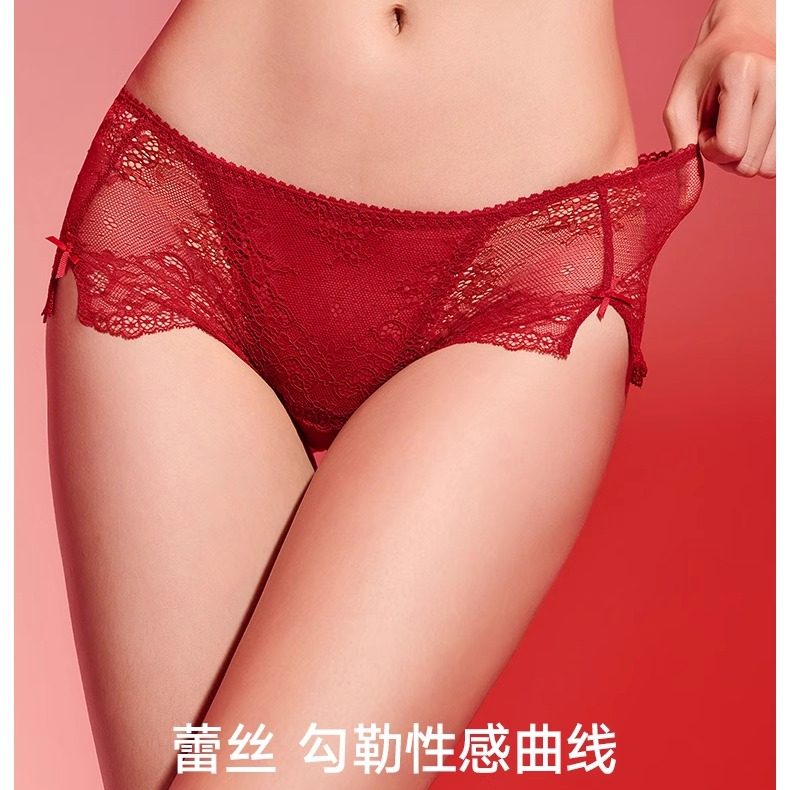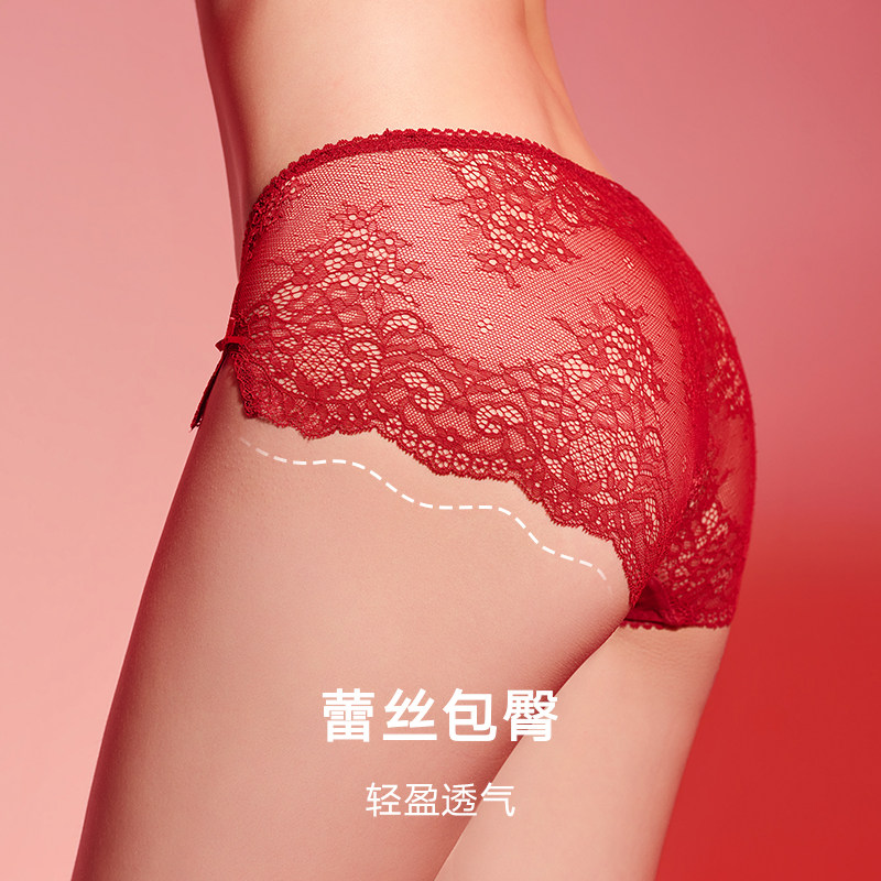 天猫曼妮芬性感蕾丝本命年红色内裤女士三角裤中腰法式浪漫纯棉裆底裤