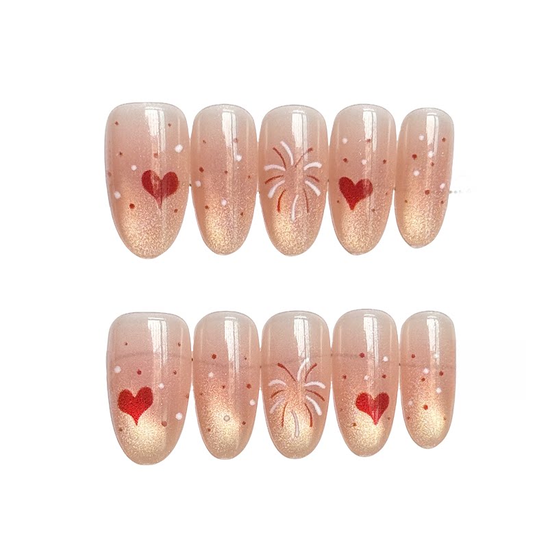 这款裸色腮红渐变爆闪烟花猫眼美甲贴片,专为秋冬设计,短款造型精致百搭,轻松适配各种甲型。以温柔裸色为基底,融合细腻的腮红渐变,仿佛肌肤自然透出的红晕,显白又显气质。指尖点缀爆闪烟花元素,搭配梦幻猫眼效果,在光线下折射出璀璨光泽,灵动吸睛。整体风格可爱又不失高级感,无论是日常通勤还是约会聚会都能轻松驾驭。穿戴式设计方便快捷,无需美甲师也能拥有专业级美甲效果,是秋冬指尖时尚的完美选择。