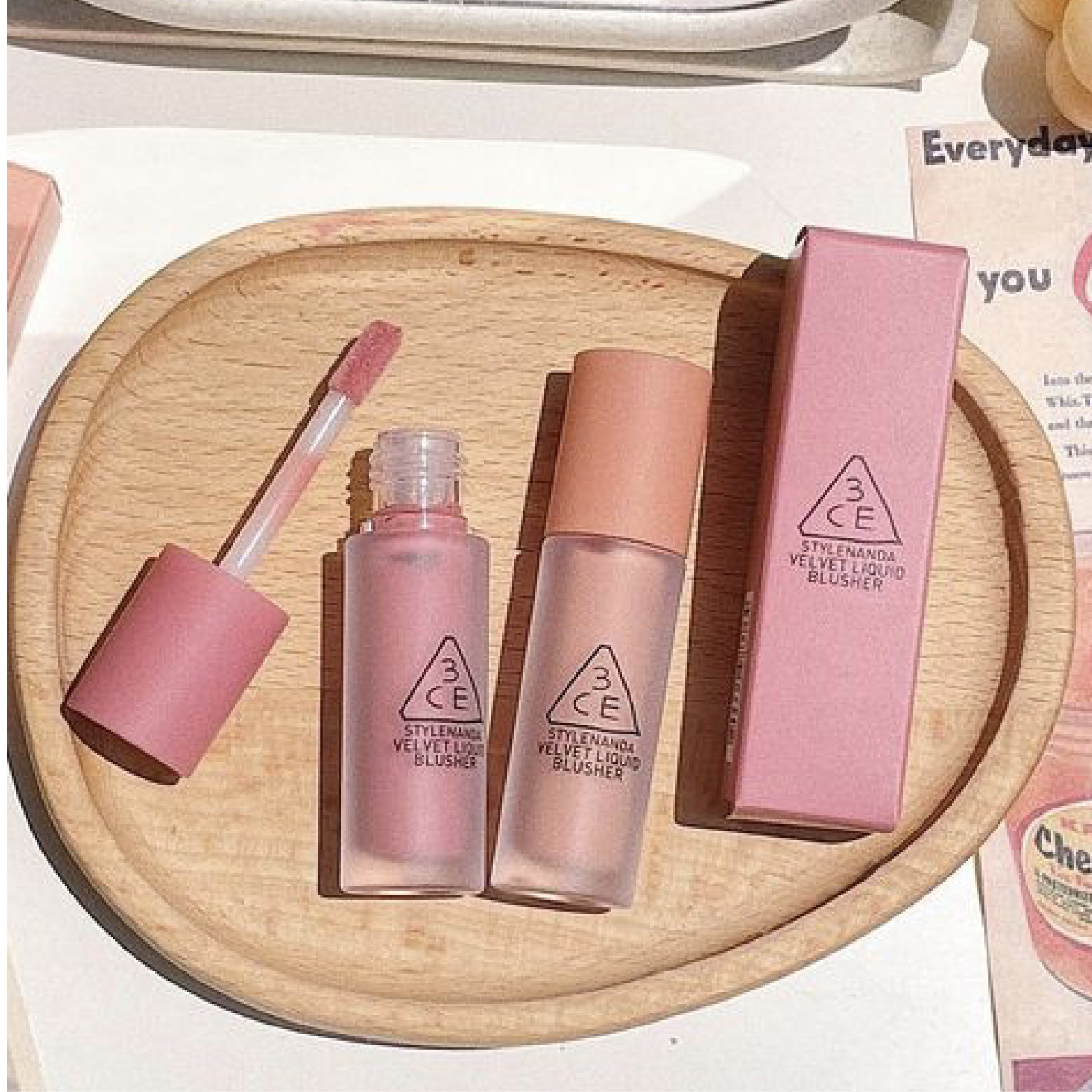 3CE液体腮红以其轻盈质地与持久显色深受喜爱。推荐四款热门单色:#LikeThat 是温柔豆沙粉,适合日常通勤;#Mono Pink 为经典玫瑰粉,提气色又不失优雅;#How Dare 是略带灰调的干枯玫瑰色,高级感十足,适合冷白皮;#Nude Peach 则是低调的裸杏色,自然融于肌肤,打造伪素颜妆效。液体质地易推开,干后呈半哑光,贴合度高,可用指腹或海绵拍开,轻松晕染出自然红润感。无论是叠涂还是单色使用,都能为妆容增添细腻层次,是打造韩系清透妆容的必备单品。