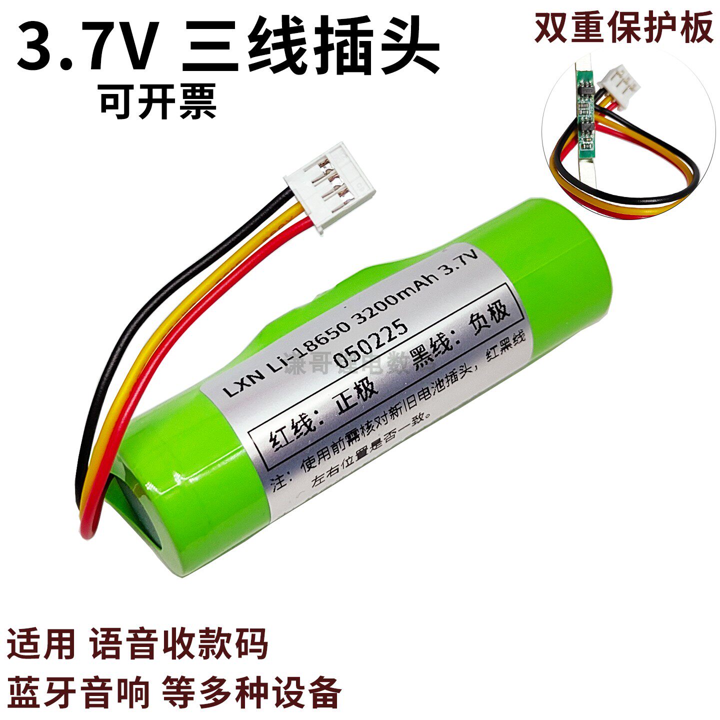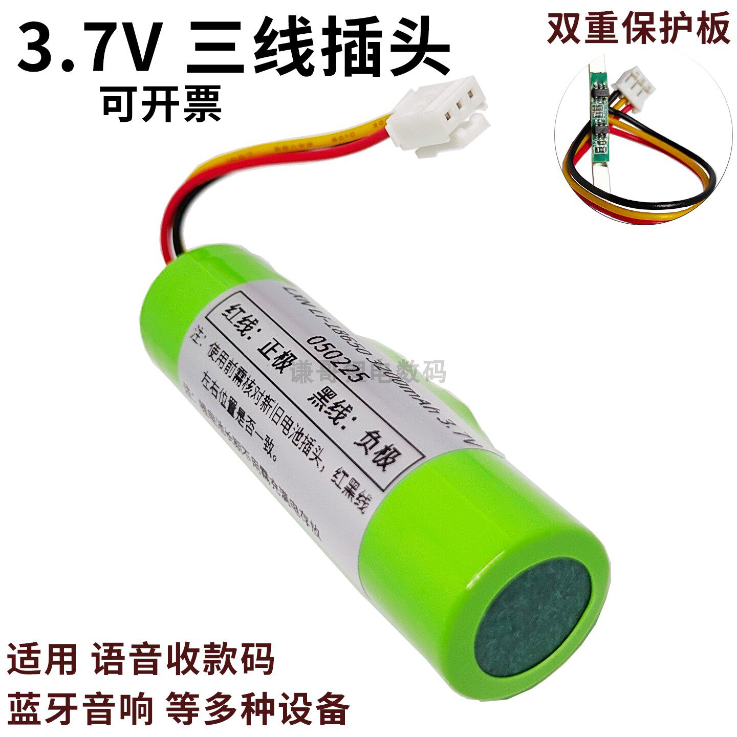 淘宝18650锂电池三线插头带NTC保护板支付宝扫码音箱微信收款电吹管