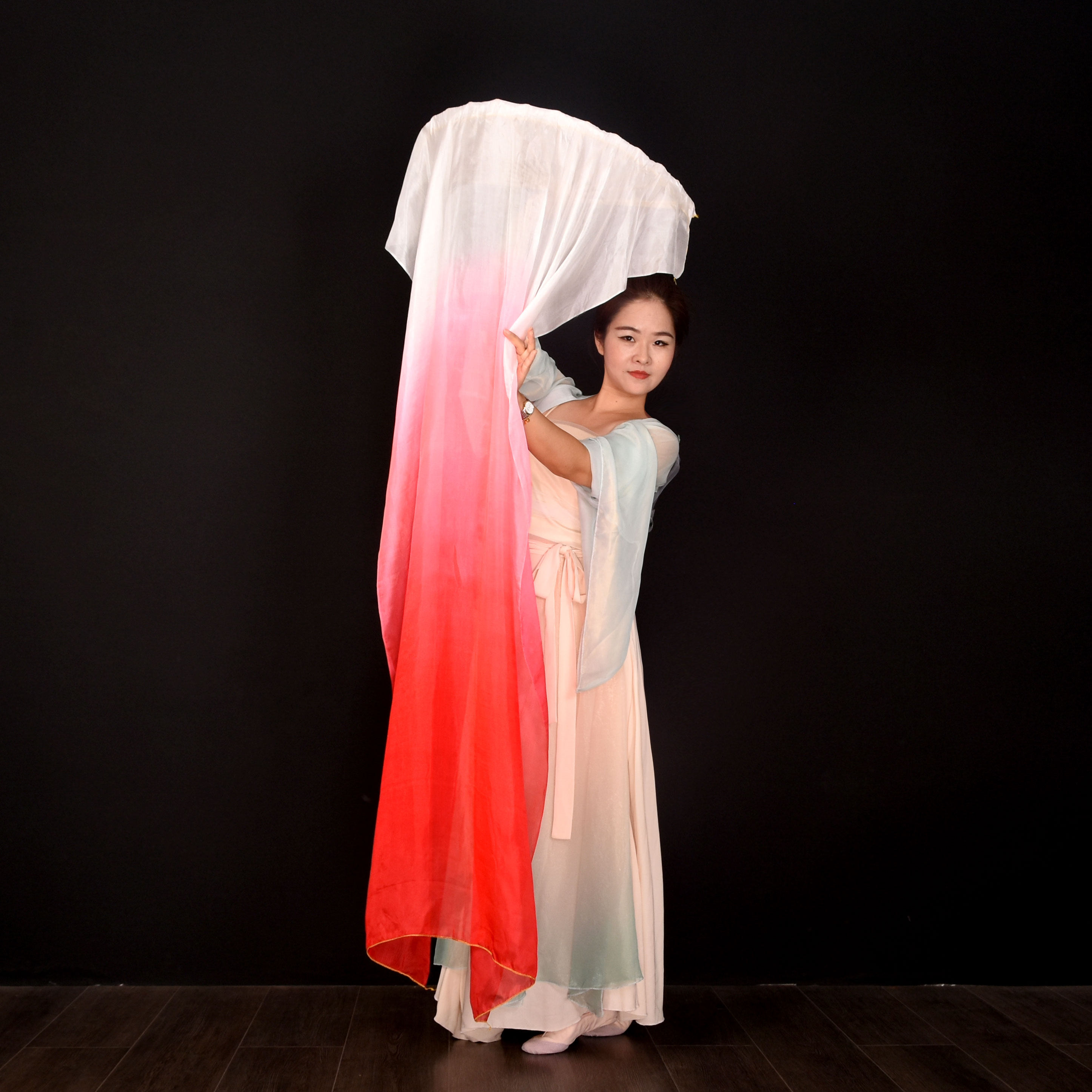 这款舞蹈扇子专为古典舞设计,采用优质真丝面料,呈现大气喜庆的大红渐变色,色彩过渡自然流畅,宛如晚霞映照。扇面宽大,搭配加长长飘绸带,舞动时飘逸灵动,极具视觉张力,完美契合《万疆》等中国风舞蹈的意境。扇骨轻盈坚韧,开合顺畅,适合旋转、甩袖、抛接等高难度动作。整体融合传统美学与现代工艺,既彰显东方韵味,又提升舞台表现力,是舞者演绎古典舞韵、展现中华之美的理想道具。无论是舞台演出还是日常练习,皆能舞动出大气磅礴的中华气韵。