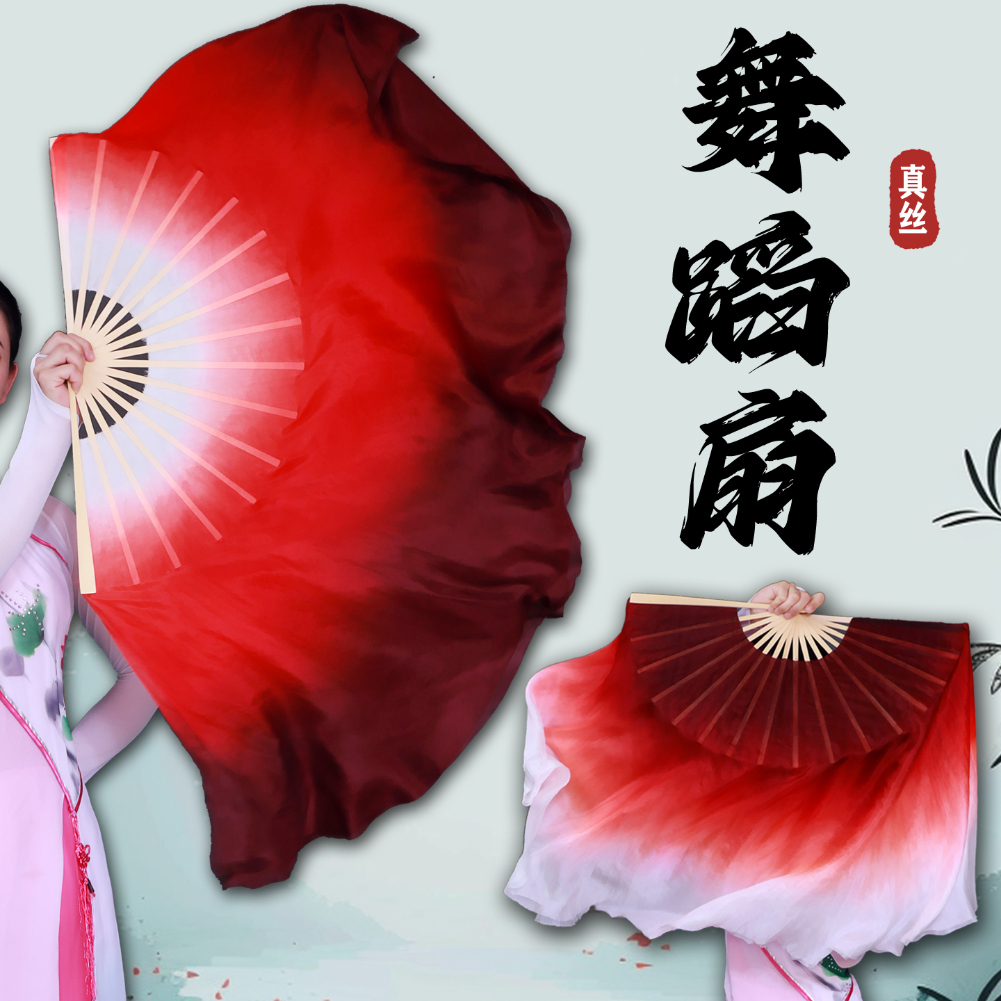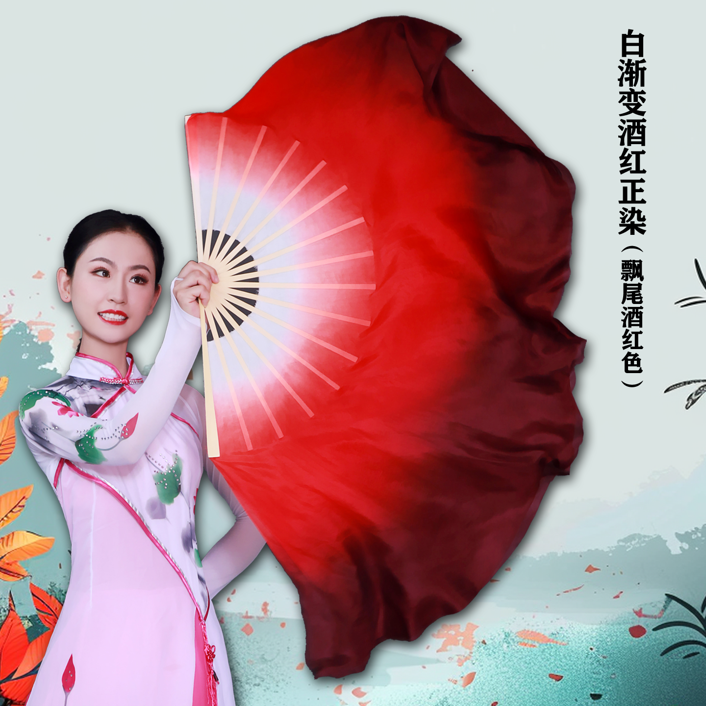 淘舞蹈扇子跳舞扇真丝大红渐变色万疆古典舞加长长飘中国风长绸扇子