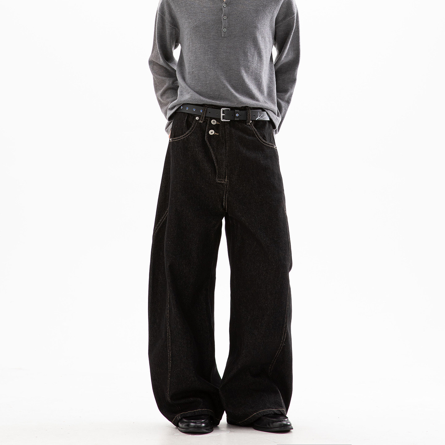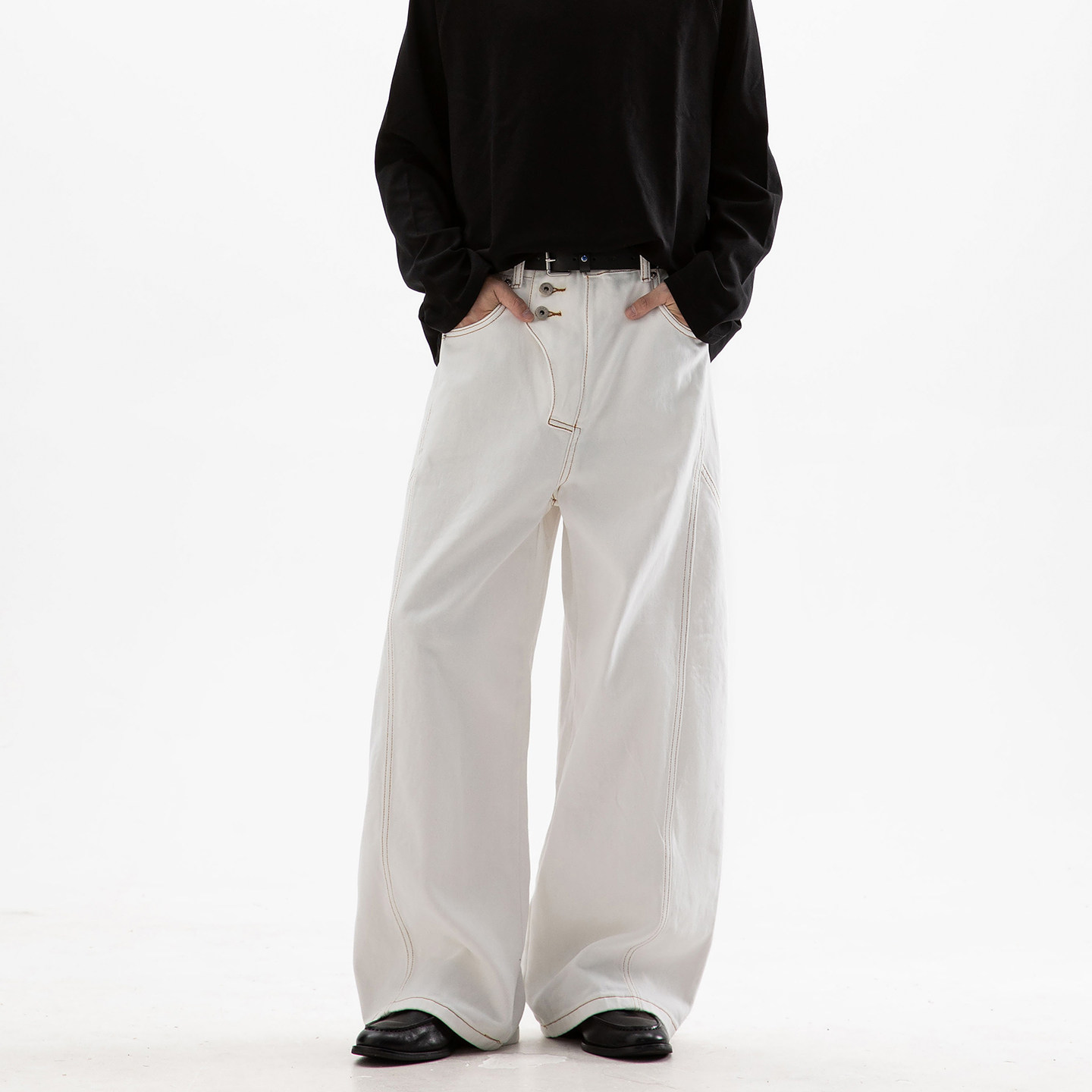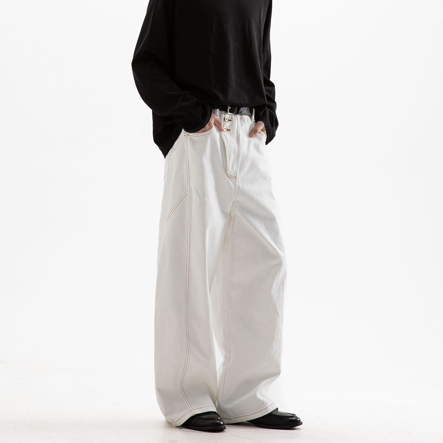 Dreammade美式解构丹宁原牛弯刀牛仔裤,以经典美式风格为灵感,融合现代解构设计理念,打造独具高级感的直筒裤型。精选高克重原色丹宁布,未经水洗处理,随穿着自然落色,呈现专属个性纹理。立体剪裁配合“弯刀”式侧缝线条,修饰腿型,提升视觉张力。细节处采用复古五金、定制皮标与加固车线,彰显匠心工艺。适合春秋季节穿搭,轻松驾驭休闲与轻熟风格。无论是搭配工装靴还是简约白T,皆能展现率性不羁的潮流态度,是追求质感与态度的男士衣橱必备单品。