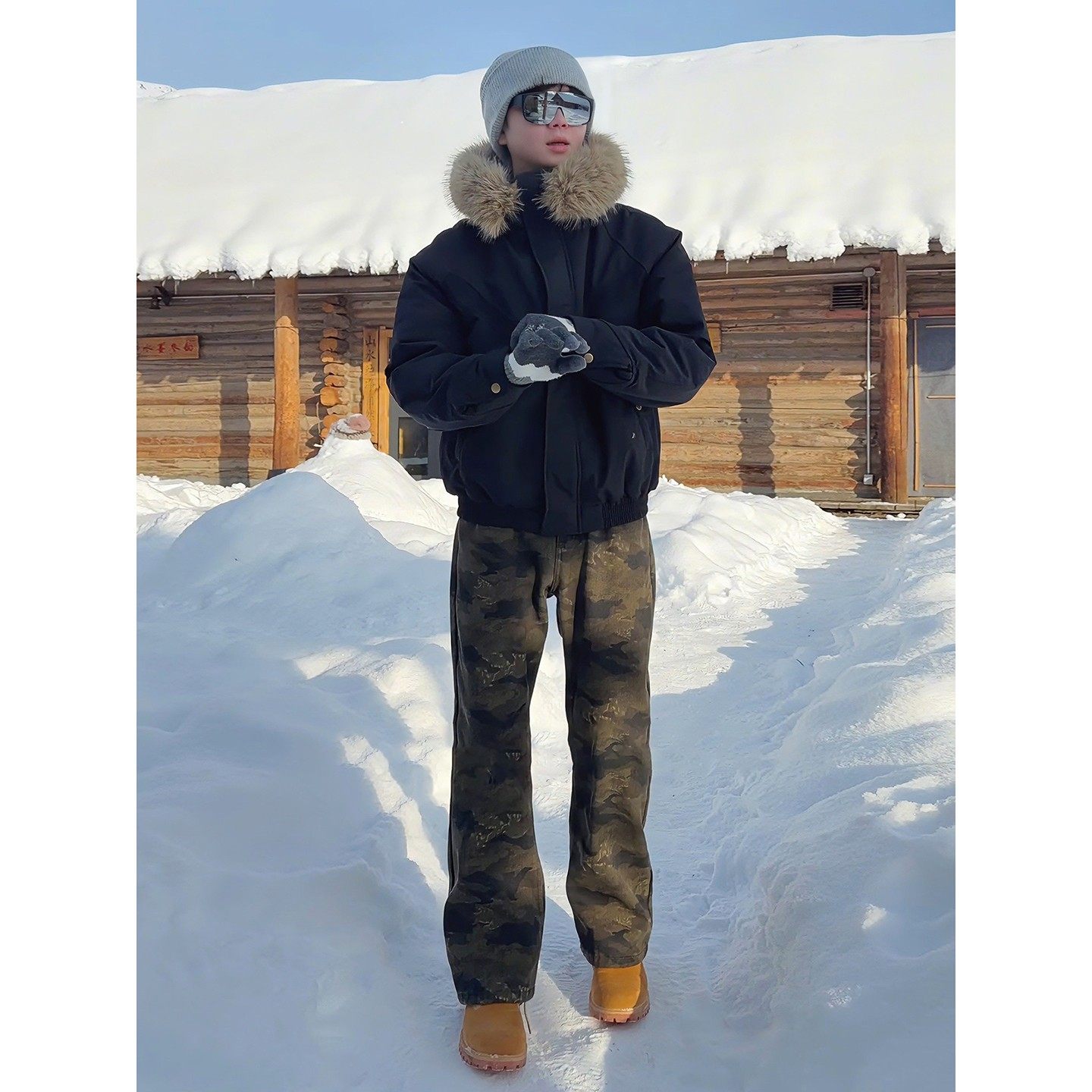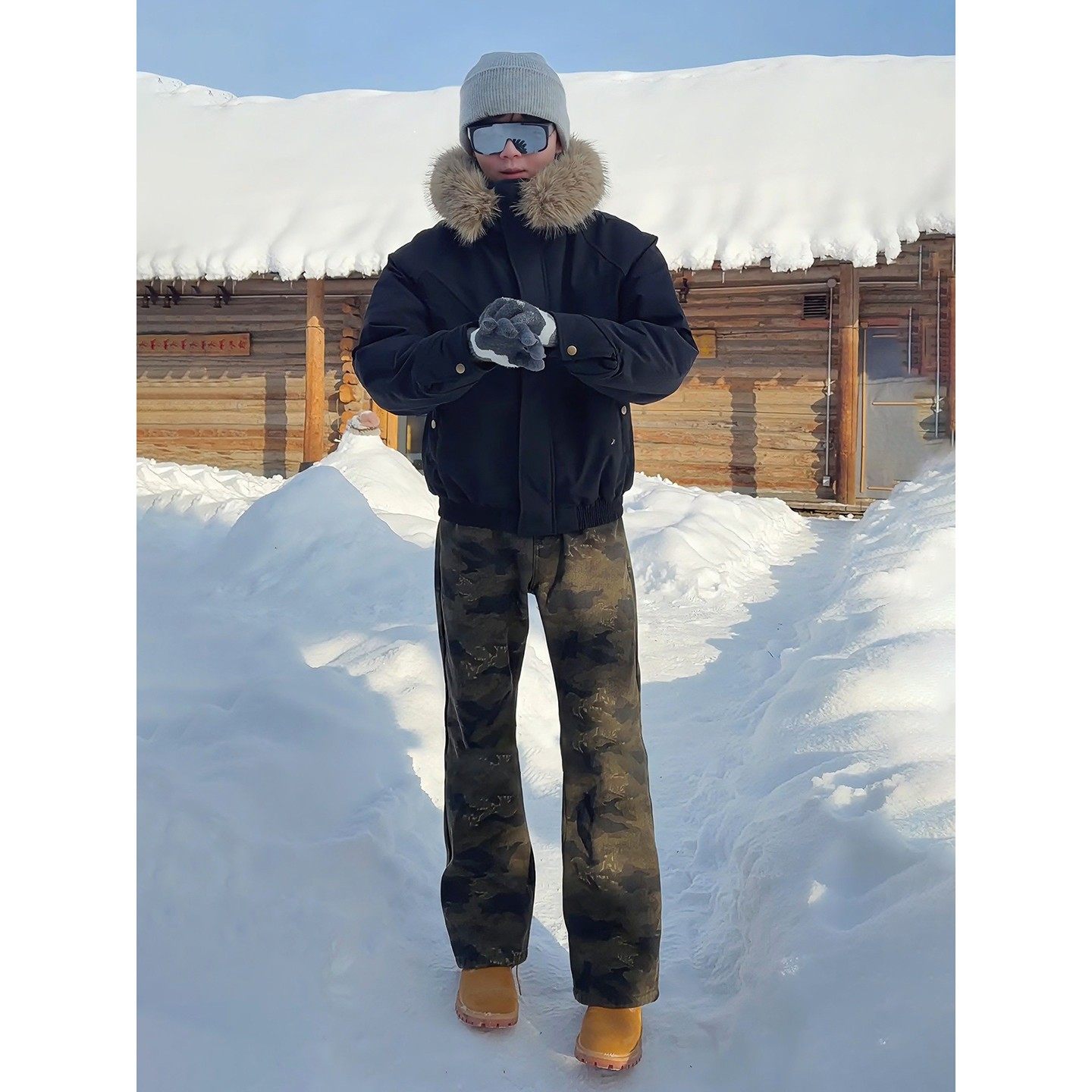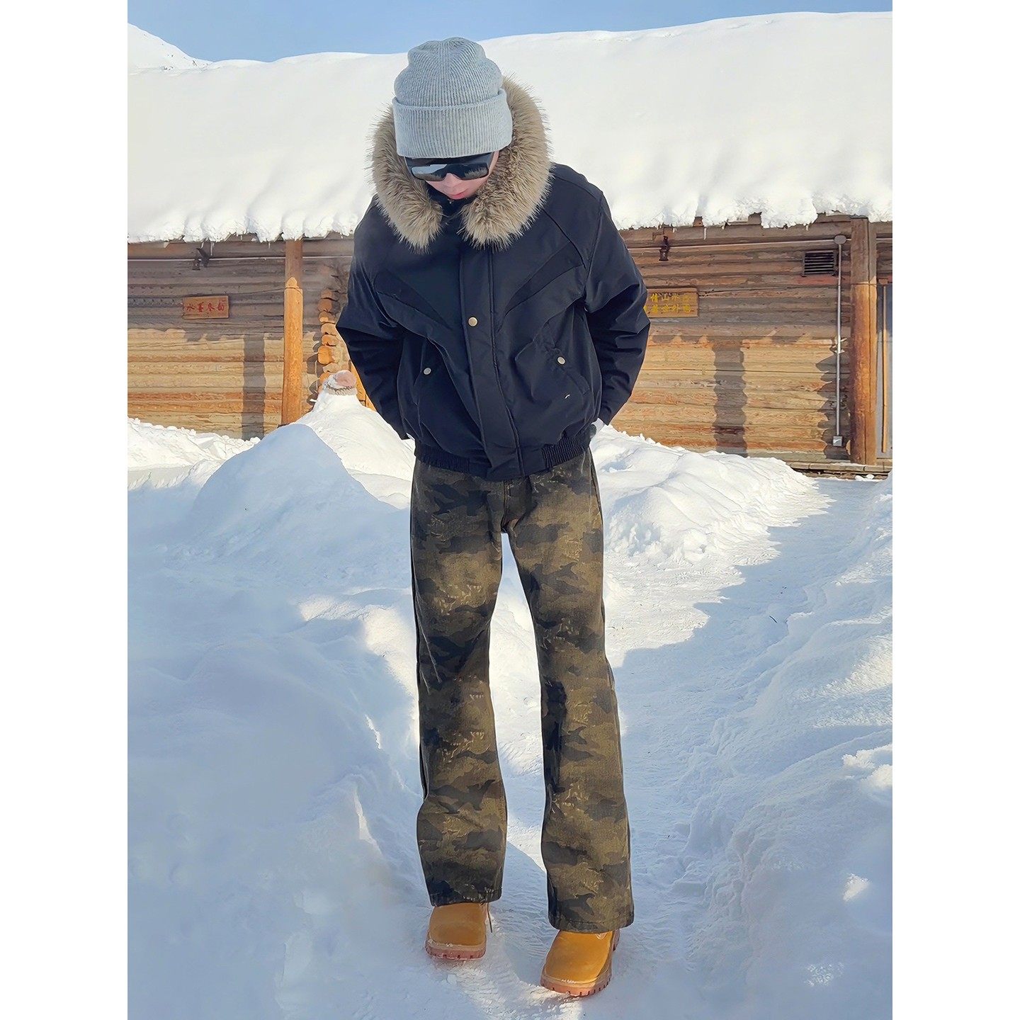 天猫美式加绒迷彩牛仔裤男冬季cleanfit弯刀工装裤修身显瘦微喇直筒裤