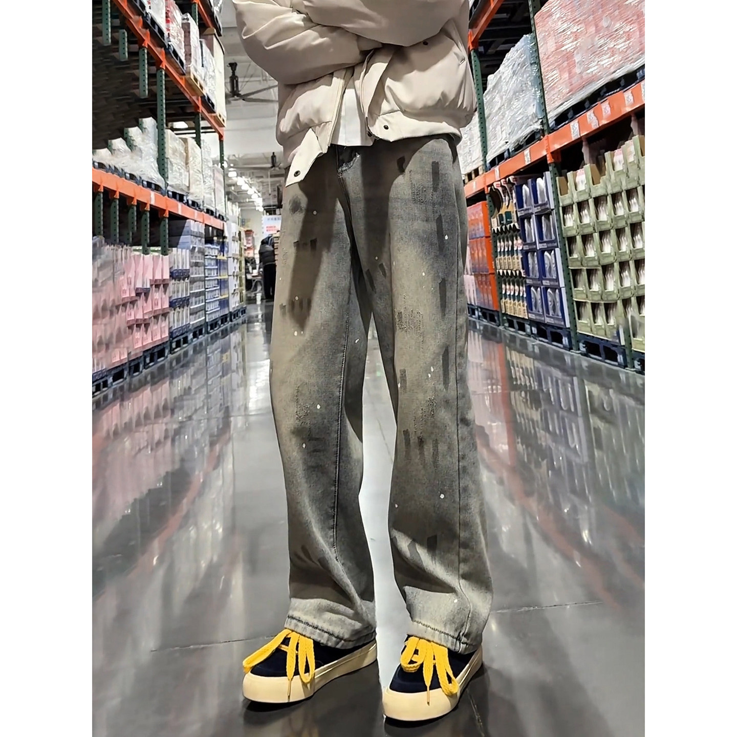 天猫蓝灰色泼墨加绒牛仔裤男秋冬美式高街vibe裤子宽松显瘦直筒微喇裤