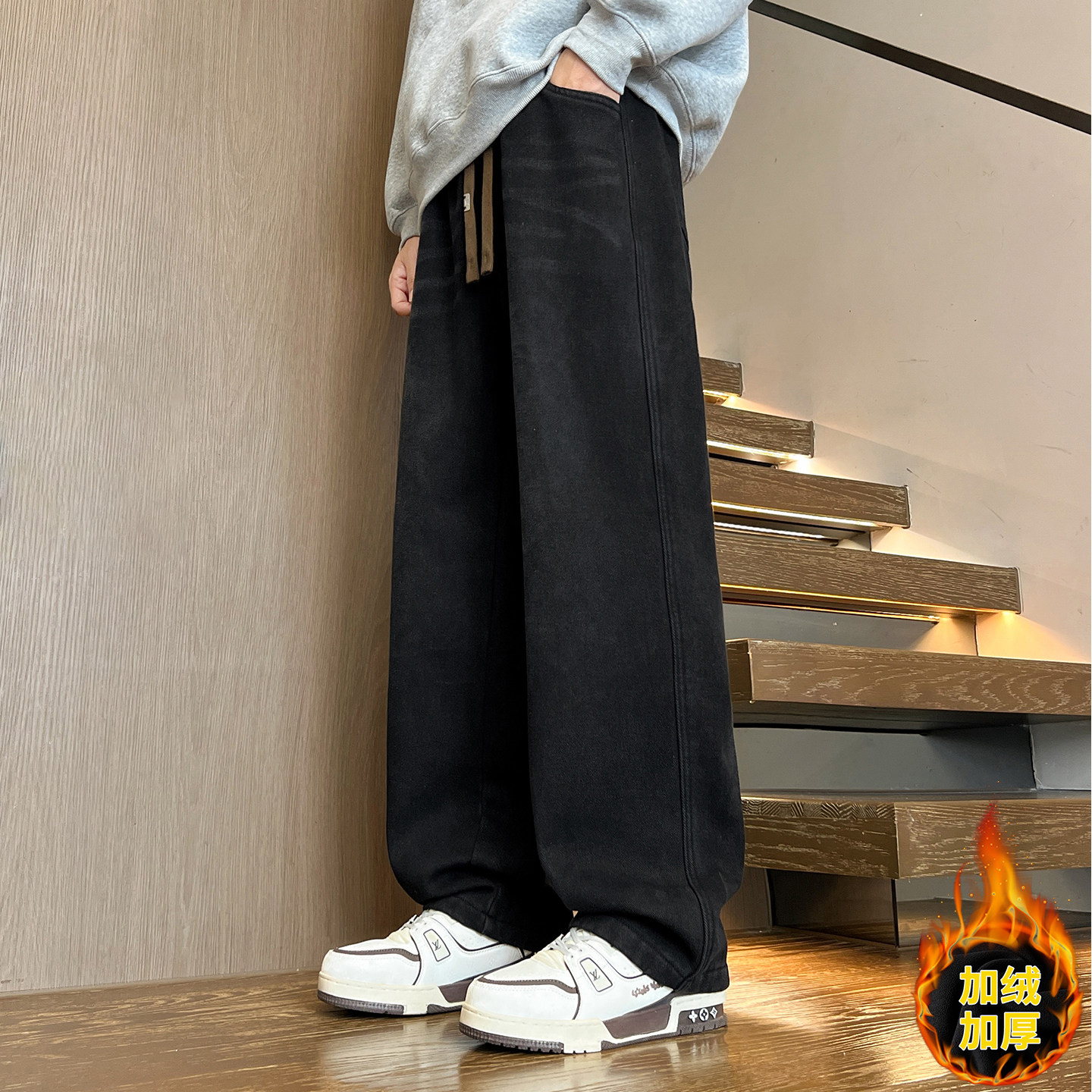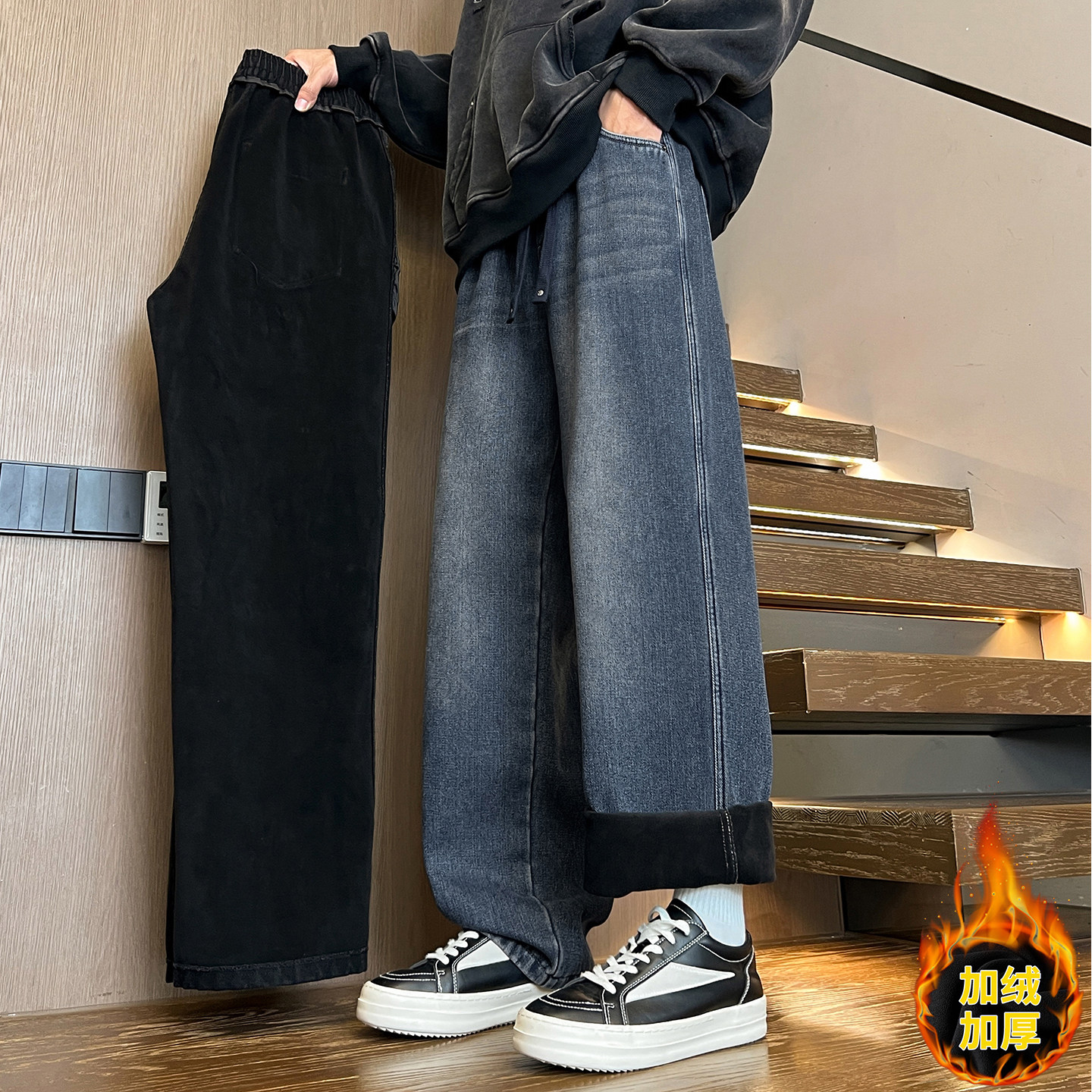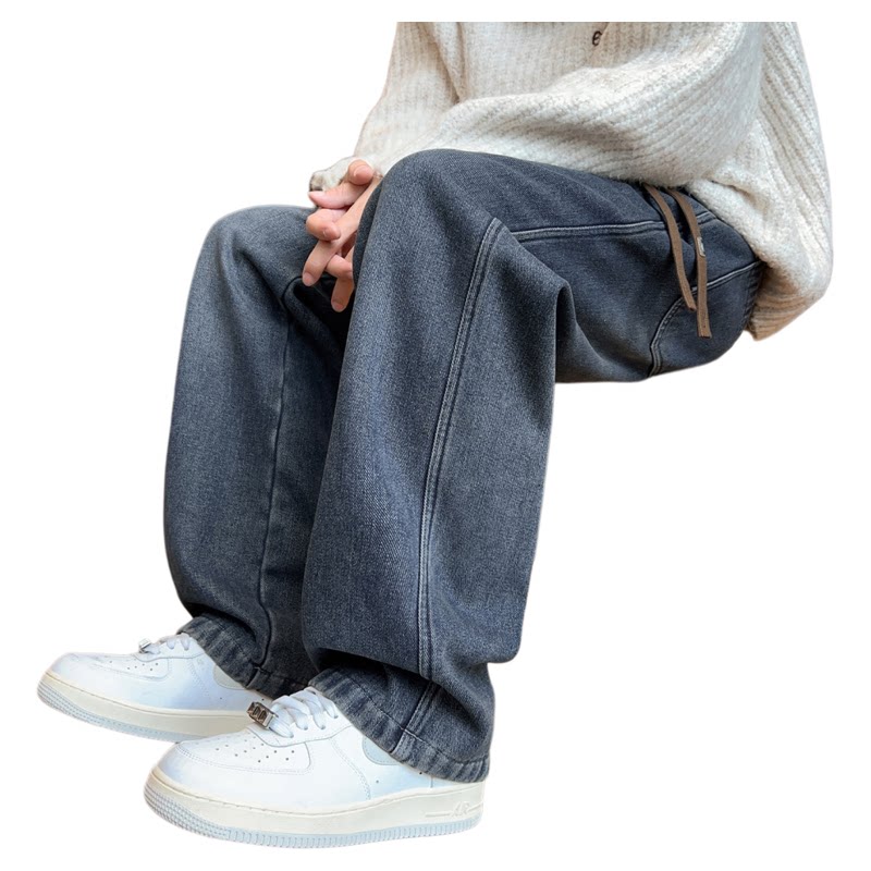 淘宝复古牛仔裤男生秋冬季新款加绒学生休闲青少年阔腿加厚长裤子男装