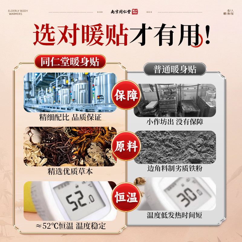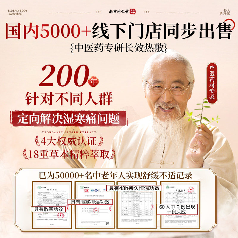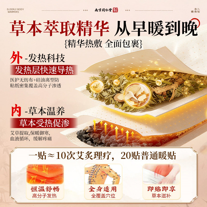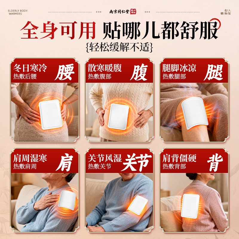 南京同仁堂暖宝宝老人专用发热贴,专为中老年人设计,采用优质铁粉、活性炭及矿物材料,安全恒温发热,可持续发热约24小时,温度适宜不烫伤。产品通过国家相关检测,品质有保障,官方旗舰店直售,确保正品。贴布柔软亲肤,透气性好,可轻松贴合腰、背、腹、关节等部位,有效缓解寒冷带来的不适与酸痛。无明火、无异味,使用便捷,是冬季保暖、热敷理疗的理想选择。特别适合怕冷、关节疼痛或血液循环不佳的老年人日常使用,温暖贴心,守护健康。