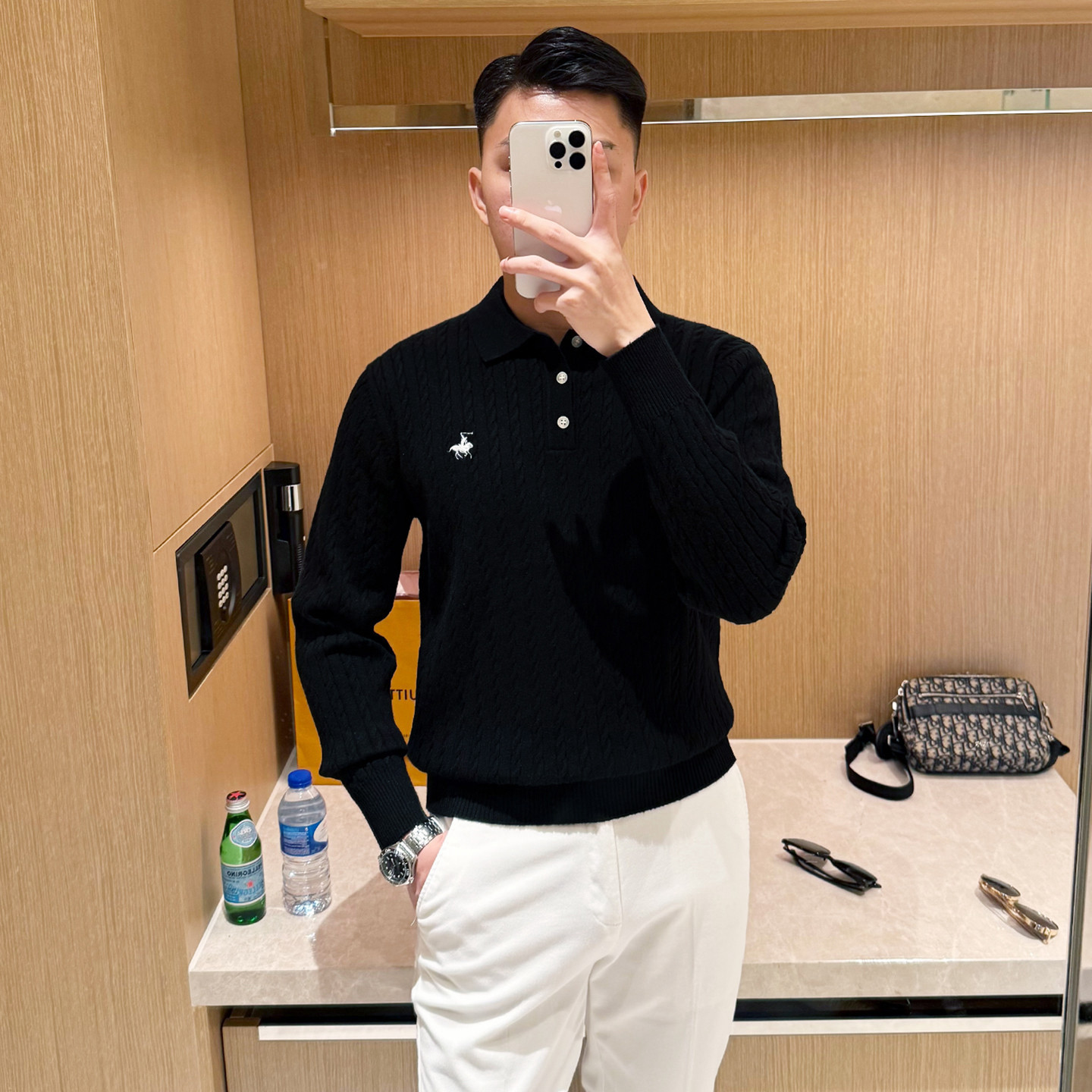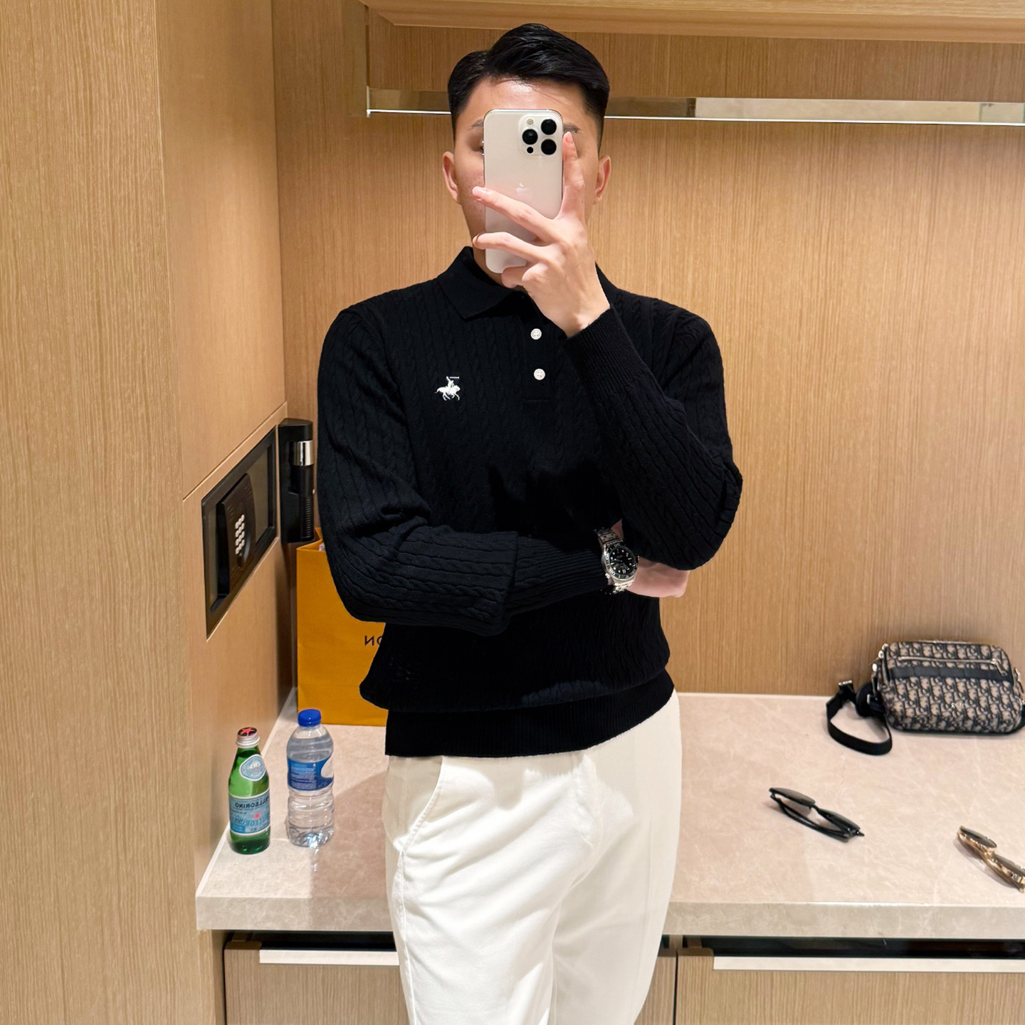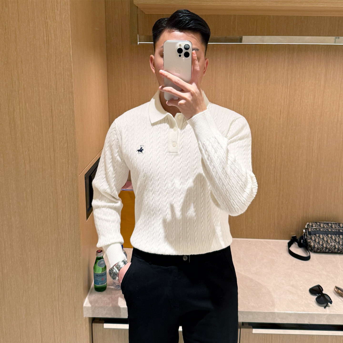 淘宝老钱风男装时尚复古扭花修身翻领毛衣男款商务通勤儒雅男士polo衫