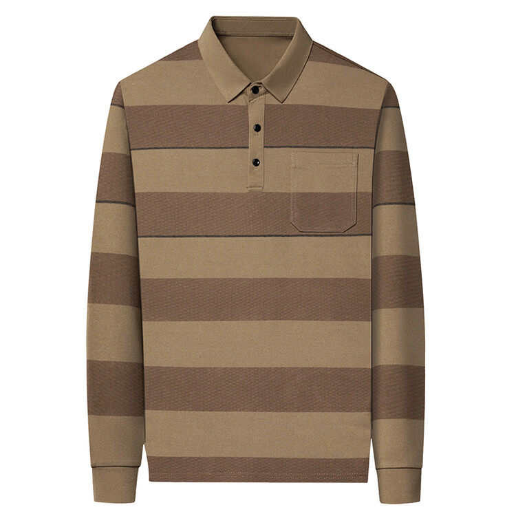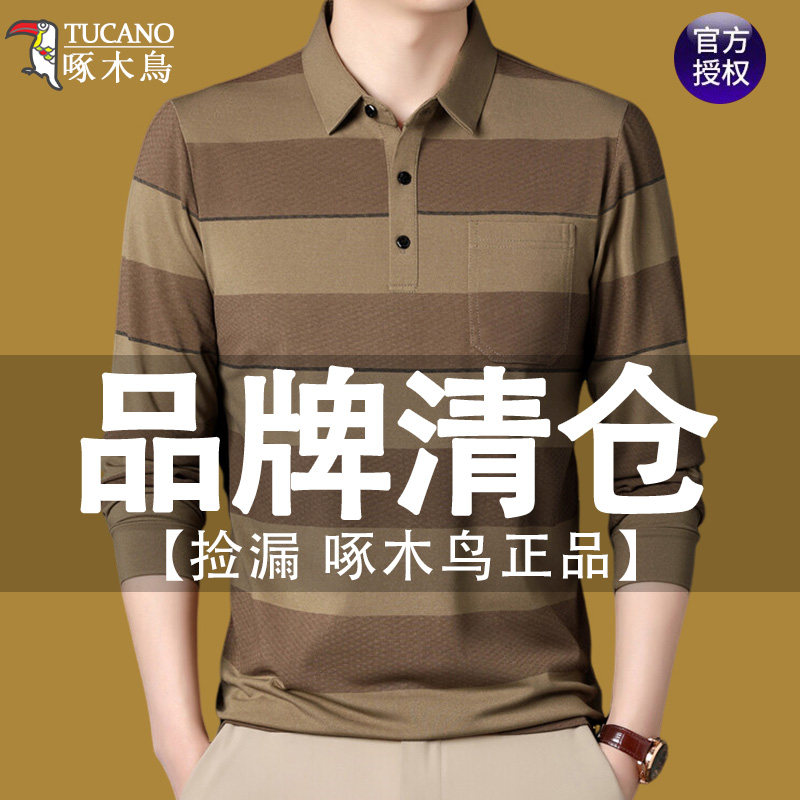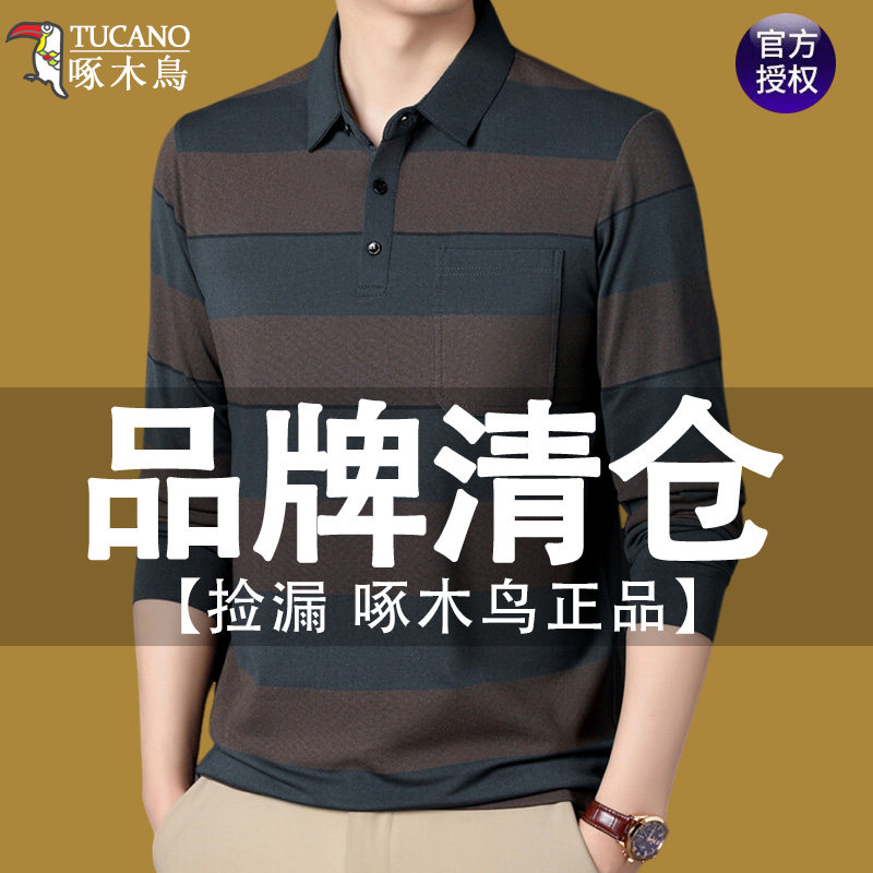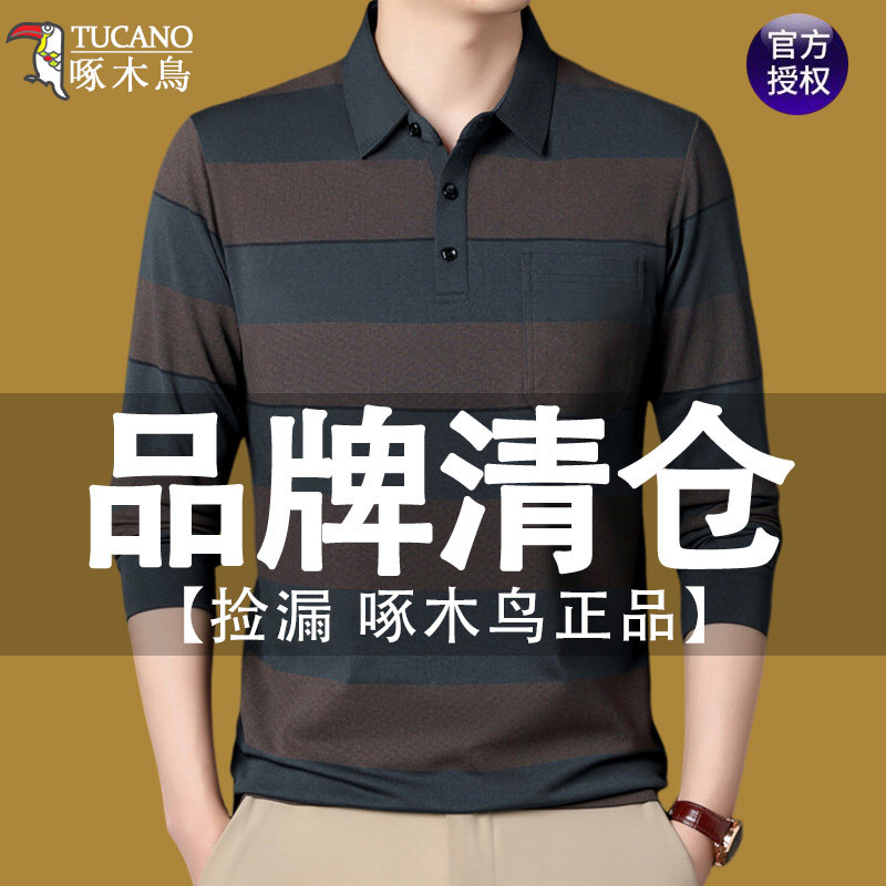 淘宝啄木鸟高档条纹长袖t恤男士春秋款棉质真口袋翻领中老年爸爸装