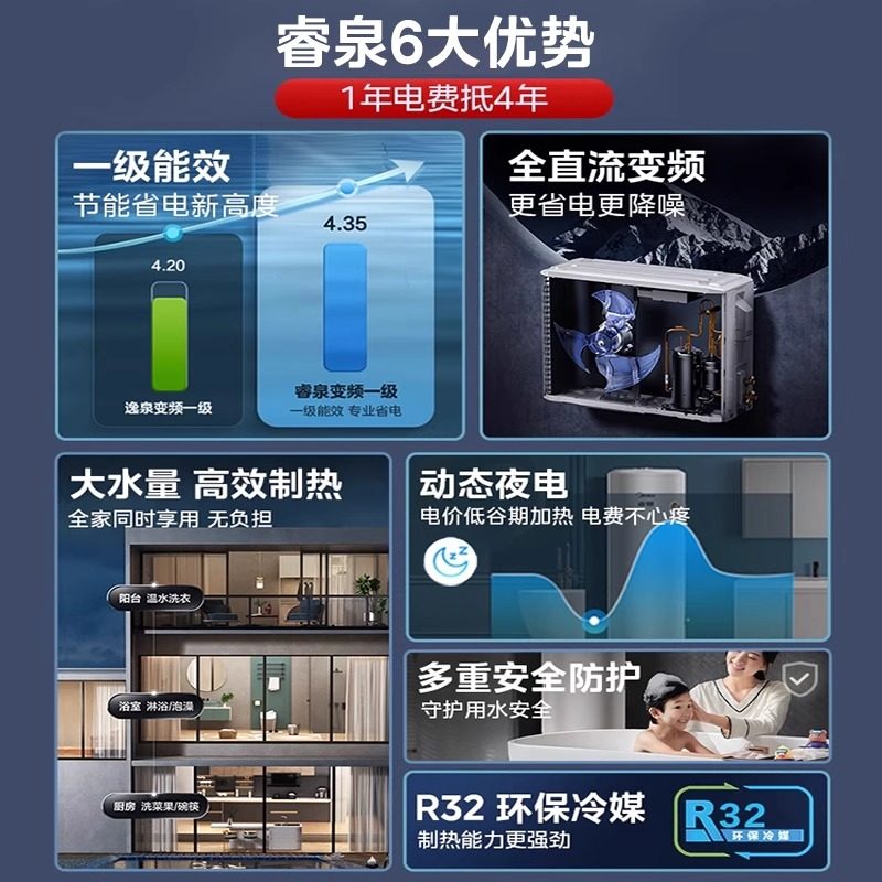 美的空气能热水器“睿泉”系列,200升大容量设计,满足全家日常热水需求。采用一级能效标准,高效节能,比传统电热水器省电高达75%,长期使用显著降低电费支出。搭载先进空气能技术,从空气中汲取热量加热,环保低碳。配备智能电辅热功能,在低温环境下自动启动,确保热水供应稳定无忧。支持智能预约、远程控制,使用便捷。内置多重安全保护,运行稳定可靠。现享受国家节能补贴政策,购机更实惠。美的“睿泉”集节能、高效、智能于一体,是现代家庭升级热水体验的理想之选,助力绿色生活,畅享舒适沐浴。