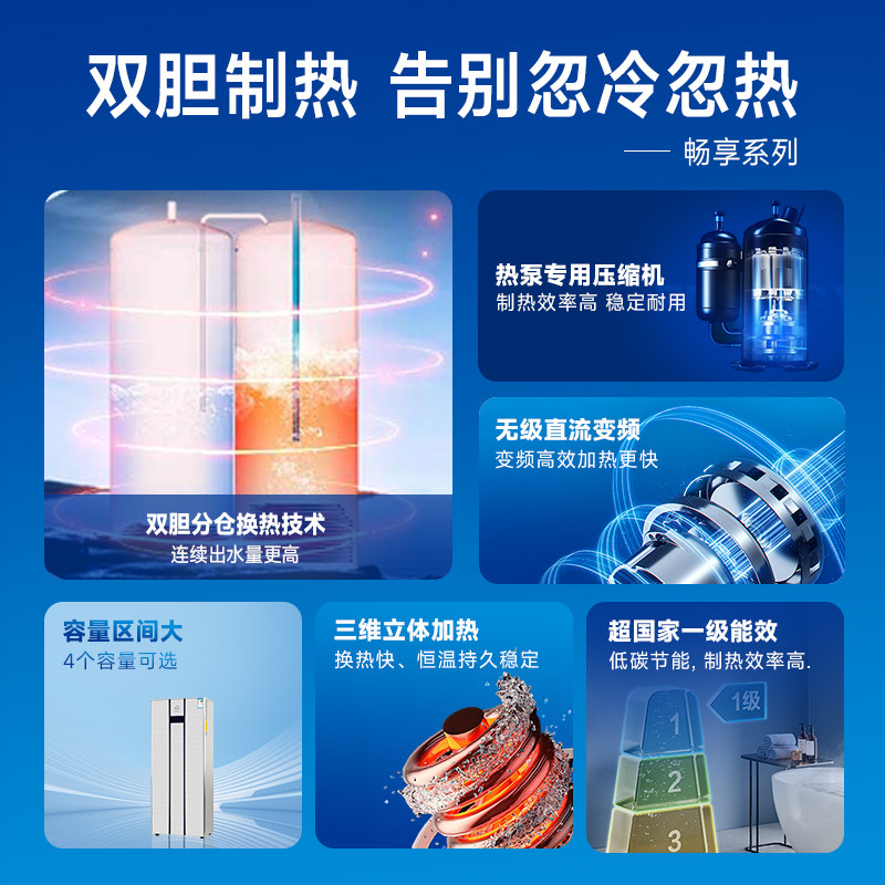 纽恩泰空气能家用分体式直流变频双胆分仓水电分离热泵热水器“畅享”系列,采用先进直流变频技术,智能调节运行频率,节能高效,恒温舒适。双胆分仓设计实现冷热水分区加热,避免混水,提升热水输出率。水电完全分离结构,杜绝漏电隐患,安全更有保障。搭载高效热泵系统,从空气中汲取热能,能耗仅为电热水器的1/4,环保省电。分体式安装灵活,适应多种家居环境。智能控制面板操作简便,支持定时预约、远程操控等功能。静音运行,全天候稳定供热,满足家庭多点用水需求,是现代绿色家居的理想热水解决方案。