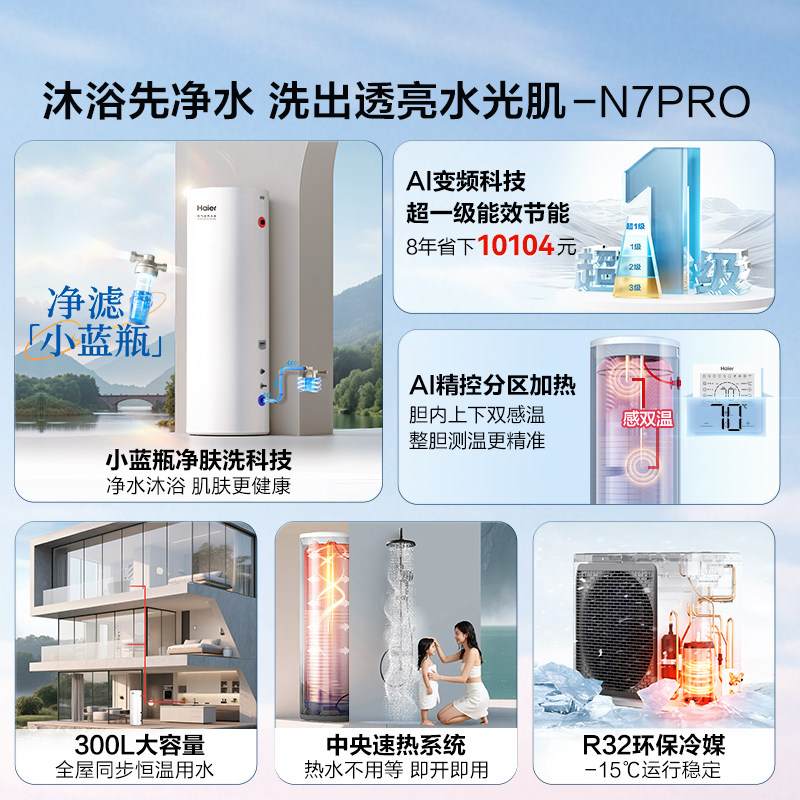 天猫海尔空气能热水器300升官方热泵商用小蓝瓶净肤洗变频大容量N7PRO