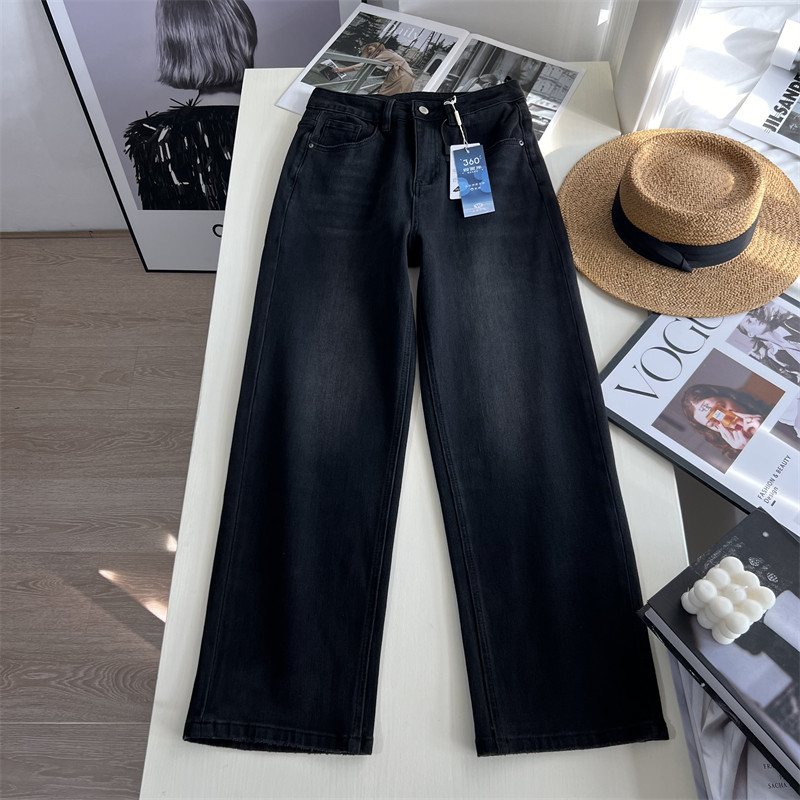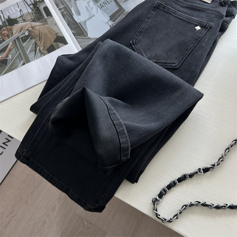 猫猫家加长女裤秋冬加绒加厚黑色微喇叭牛仔裤高腰弹力显瘦直筒裤