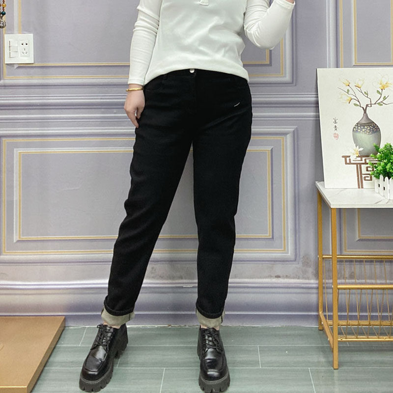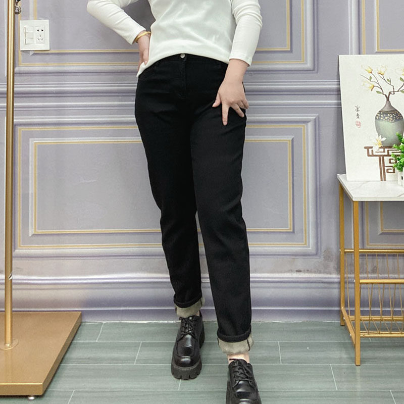 黑色牛仔裤女秋冬加绒大码胖mm梨形身材显瘦保暖窄版直筒裤长裤子