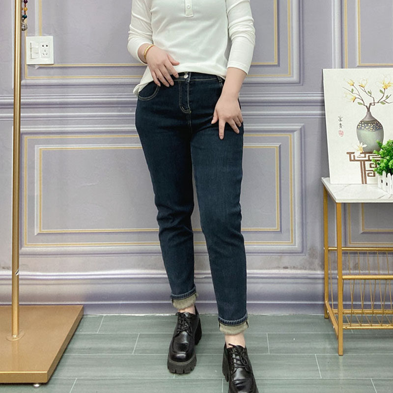 VOGANA戛纳家大码女装筷子腿复古显瘦宽松加绒厚牛仔直筒裤双版本