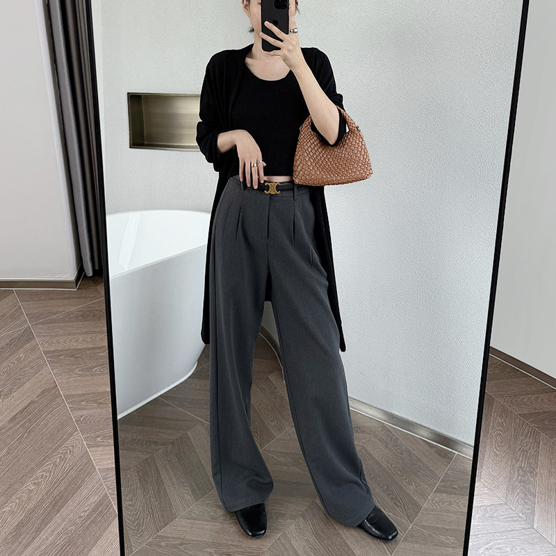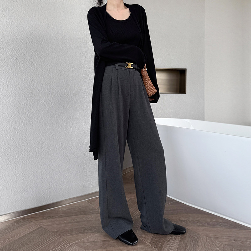 天猫灰色西装裤女春秋双褶宽松直筒休闲高腰垂感加长拖地天丝羊毛阔腿