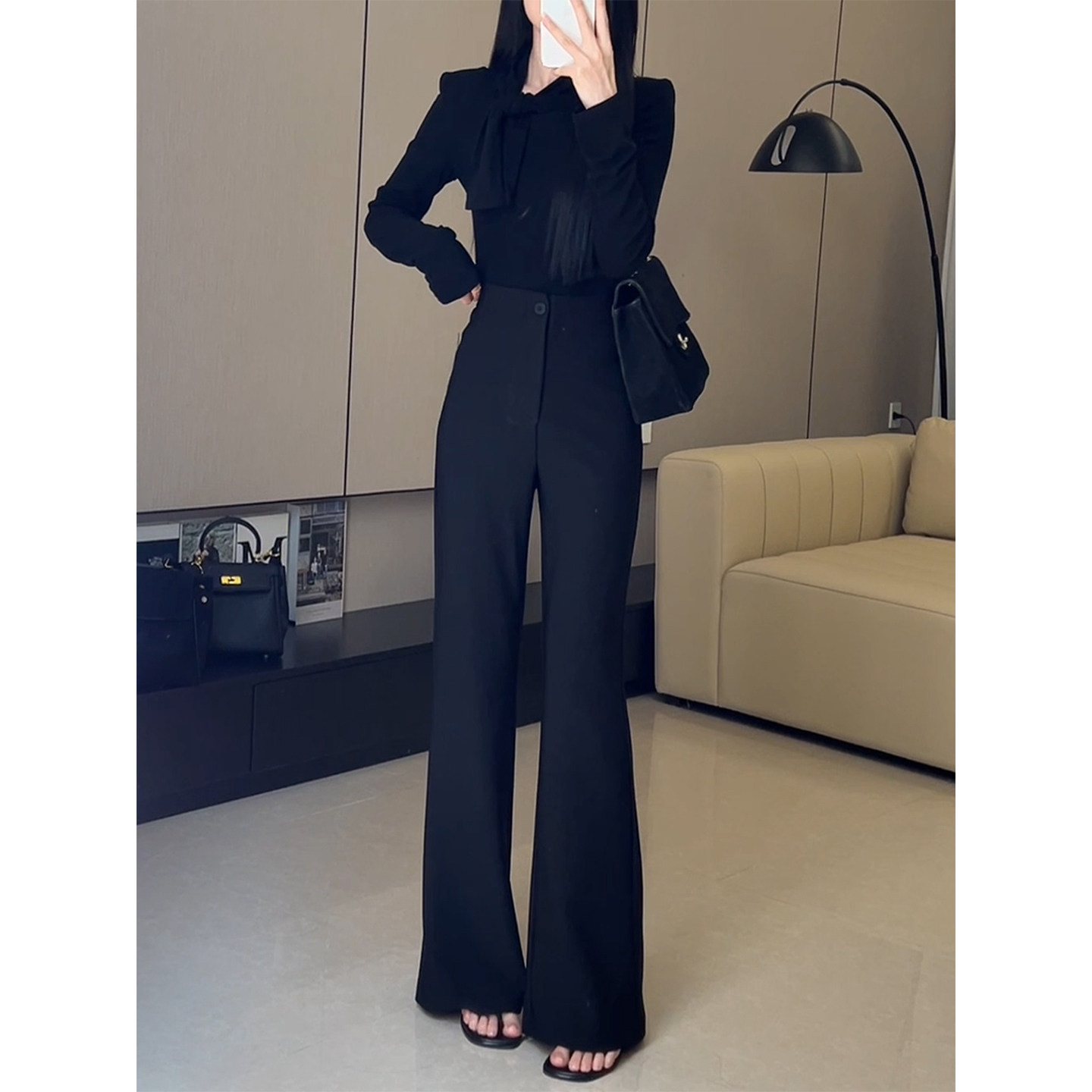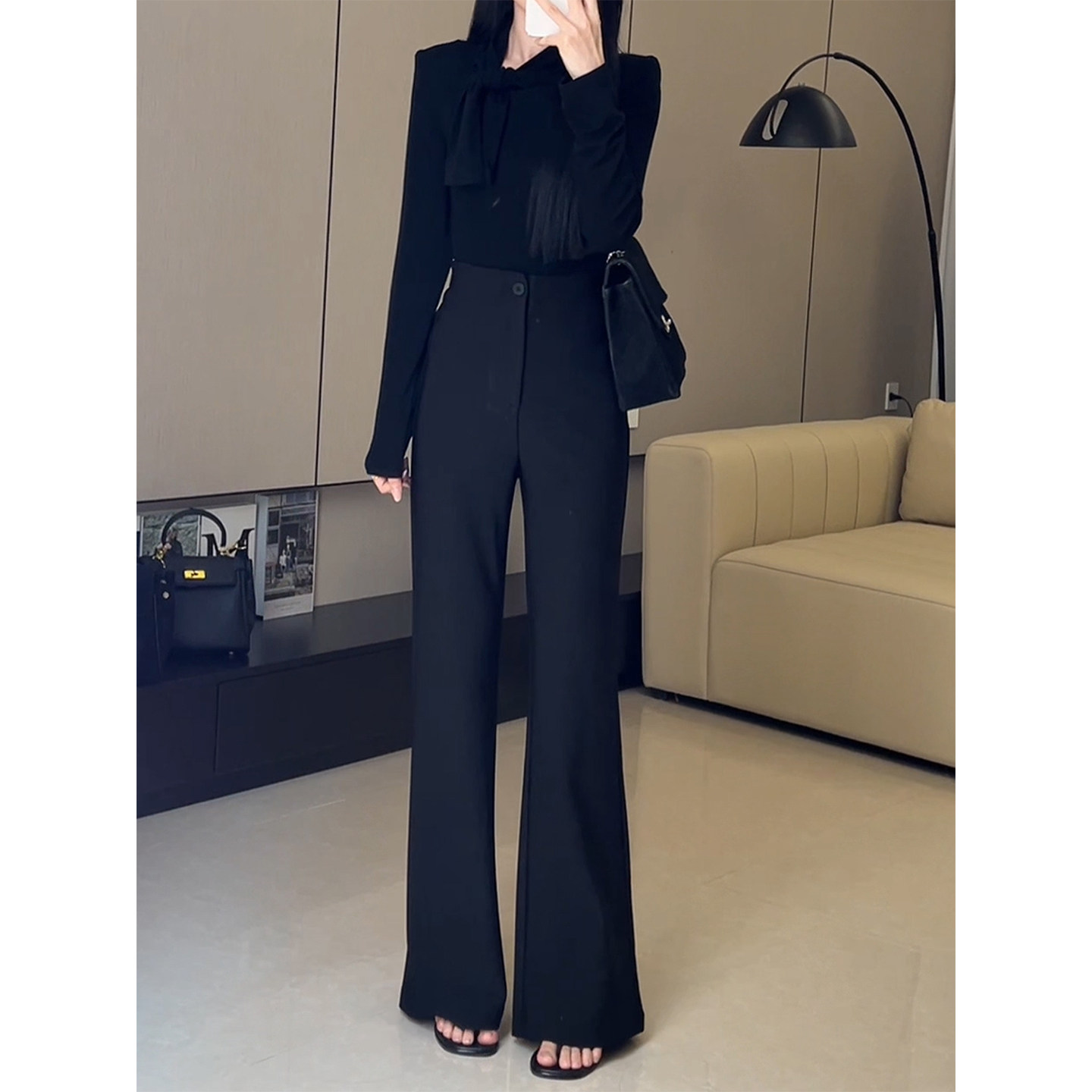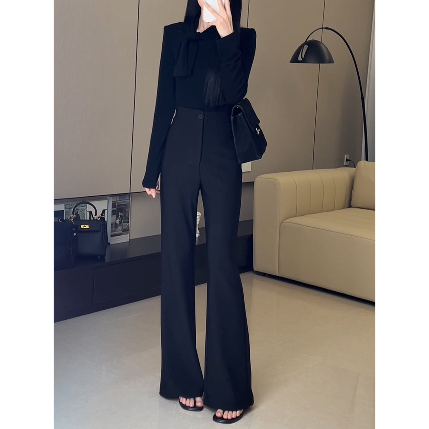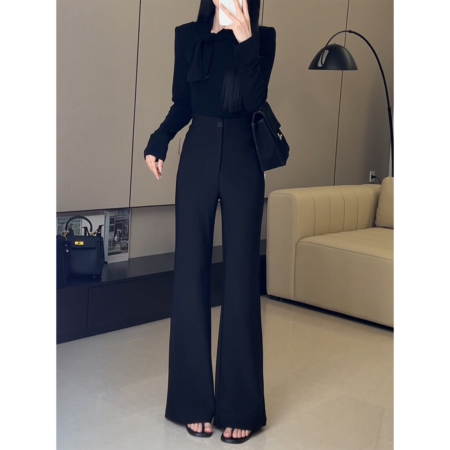 淘宝黑色气质高腰窄版微喇西装裤女2025秋冬新款不贴腿直筒拖地喇叭裤