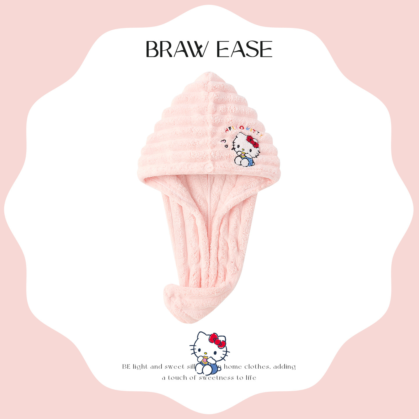 BE三丽鸥Hello Kitty正品干发帽,采用优质超细纤维材质,超强吸水、速干透气,轻松包裹湿发,减少摩擦损伤。可爱Hello Kitty印花设计,萌趣十足,专为女生打造,兼顾实用与颜值。帽身轻盈柔软,弹性适中,贴合头部不紧绷,洗头后快速吸干水分,省时省力。同时可作为浴帽使用,防止头发沾湿,沐浴护发两不误。精致包边工艺,耐用不易脱线,机洗手洗皆可。无论是居家、旅行还是宿舍使用,都是贴心必备好物。正版授权,品质保障,让每一次洗护都充满甜美仪式感。