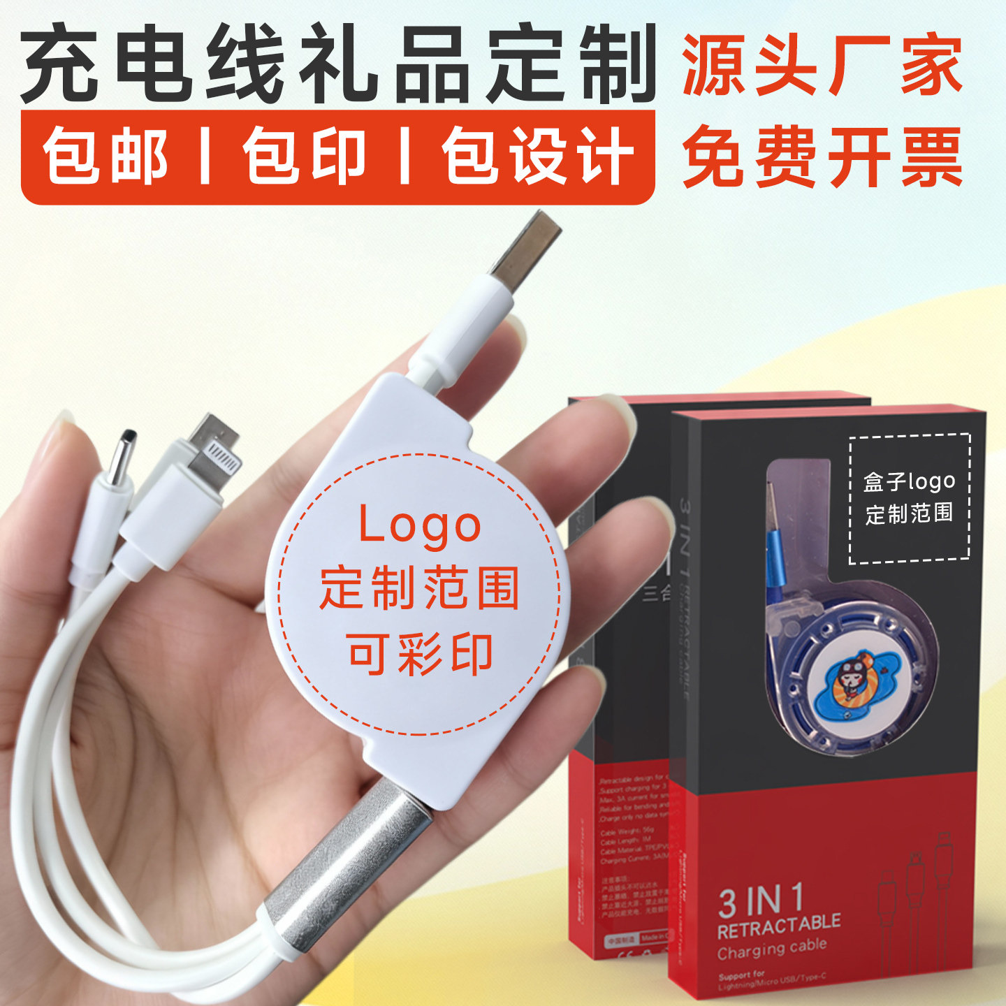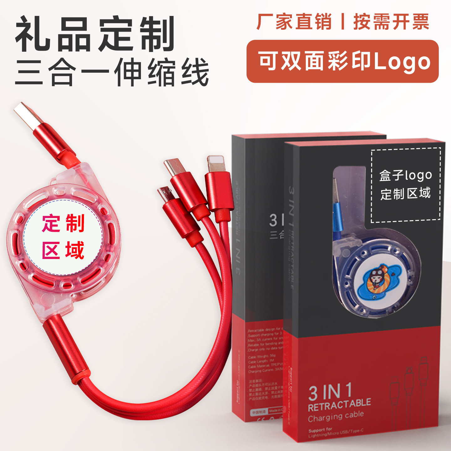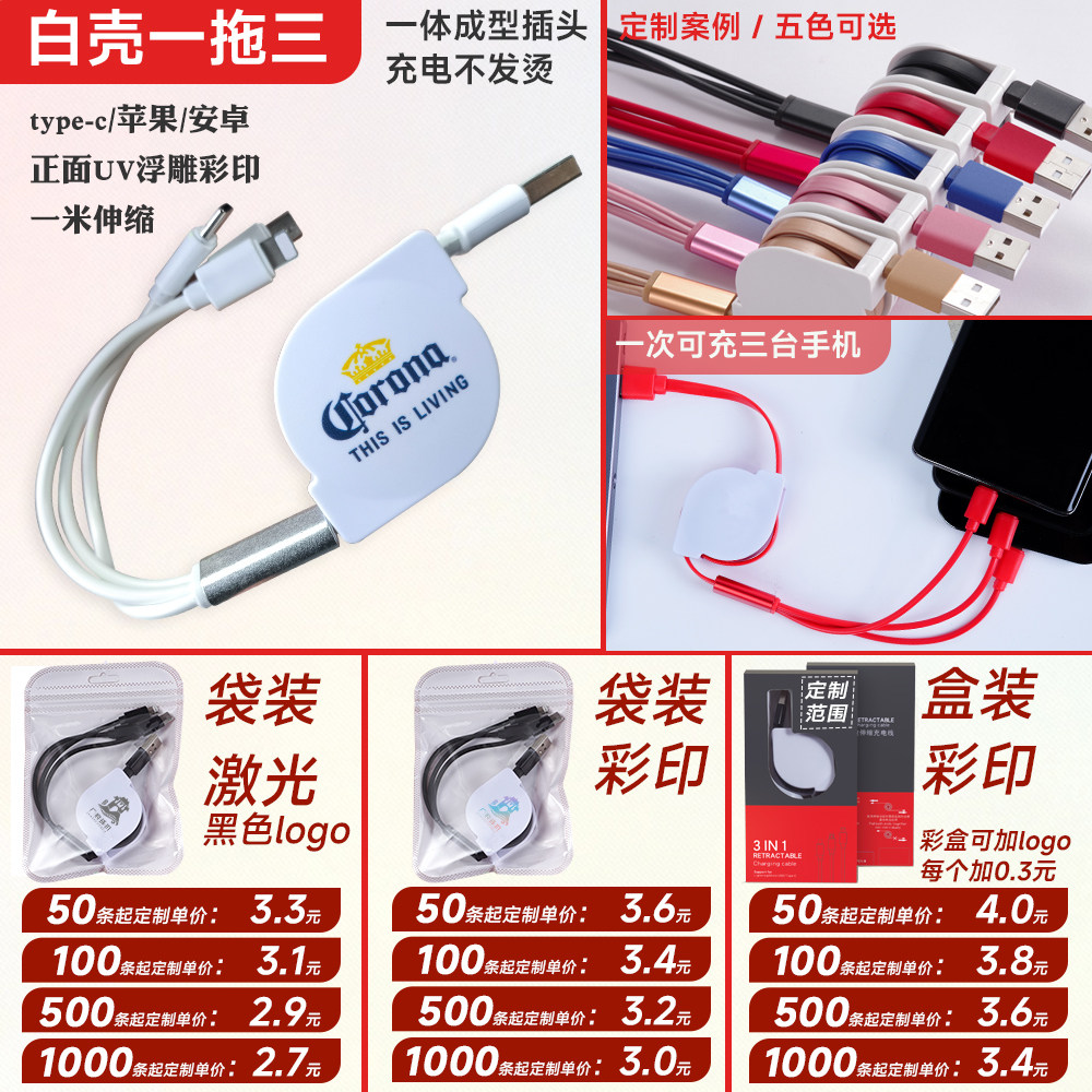 淘超级快充数据线定制LOGO刻字多功能三头伸缩手机三合一拖三充电线印广告展会公司开业活动小礼品实用赠品订做