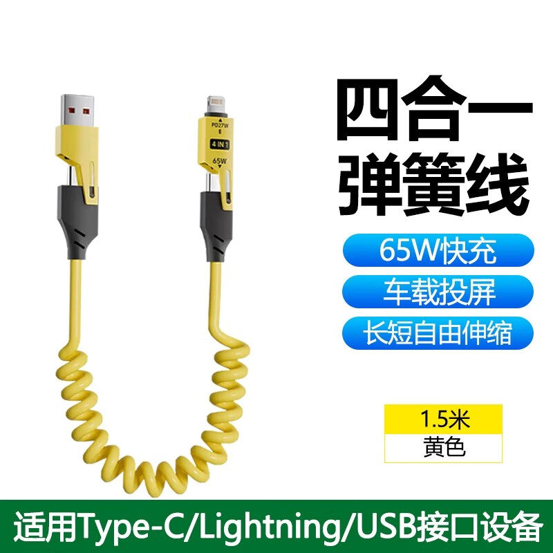 这款四合一超级快充数据线集多功能于一体,专为华为、苹果、小米等主流品牌设计,兼容性强。支持PD65W大功率快充,充电高效迅速,满足手机、平板等设备快速补电需求。内置CarPlay功能,连接车载系统更便捷,驾驶途中轻松导航、通话、听音乐。弹簧伸缩设计,长度自由调节,收纳整齐不缠绕,使用灵活方便。线体采用高强度材质,耐用抗拉扯,接口加固处理,延长使用寿命。无论是日常通勤、长途出行还是办公场景,都能提供稳定可靠的充电与数据传输体验,是智能出行的理想配件。