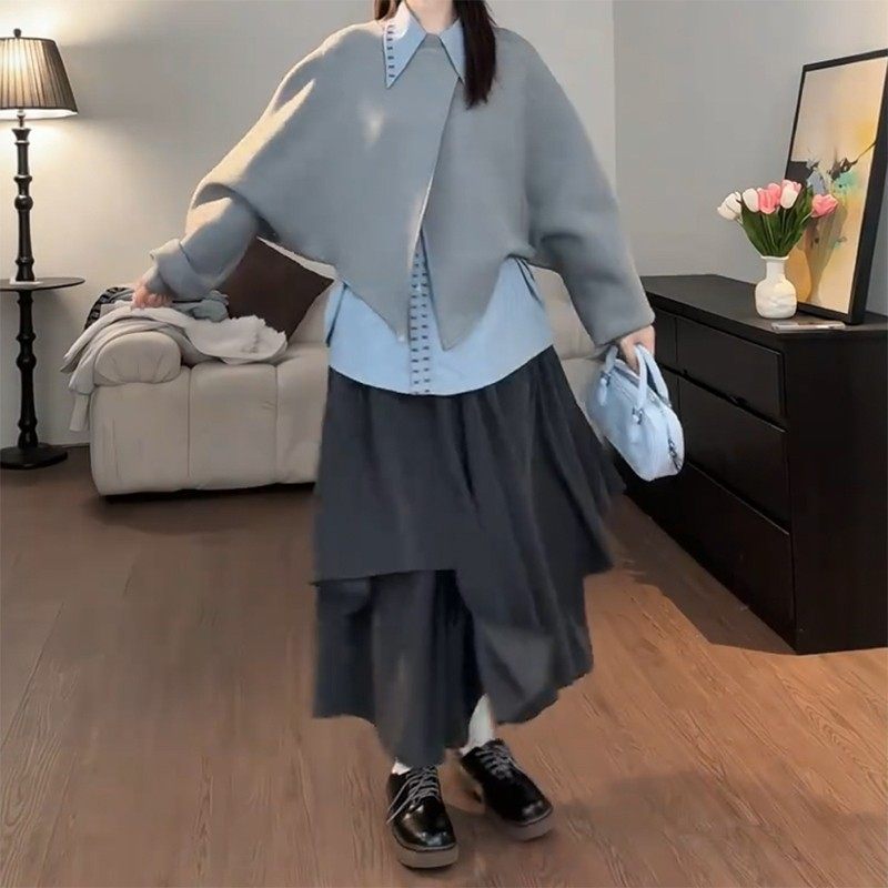 韩系学院风休闲灰色针织马甲+长袖衬衫+高腰格子半身裙女三件套装