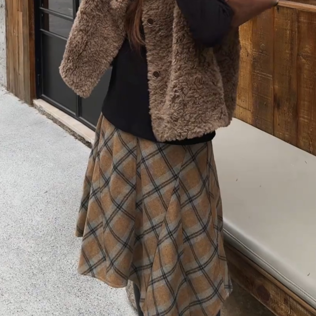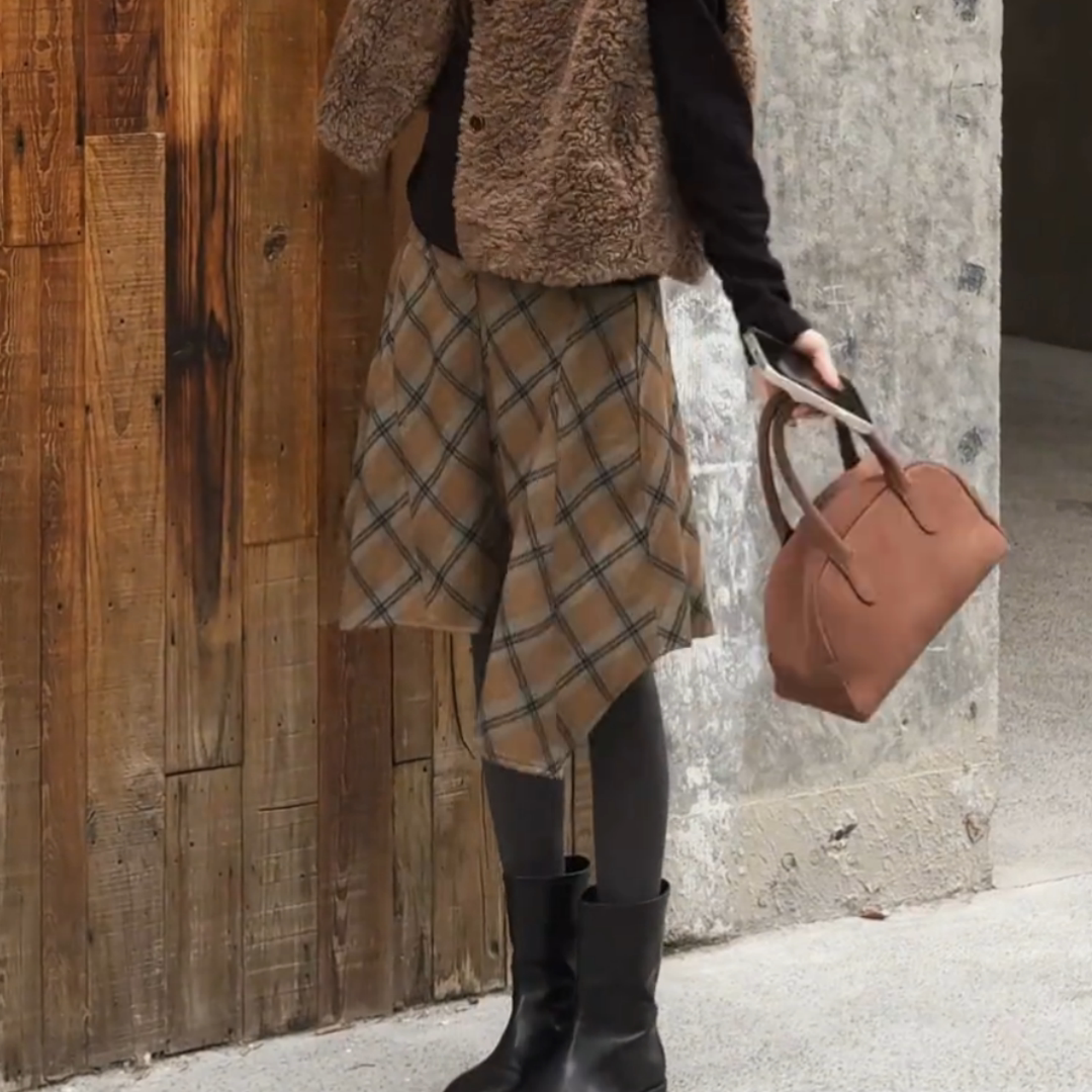 淘宝羊毛毛呢格子不规则下摆设计感半身裙女秋冬新款时尚高腰显瘦中裙