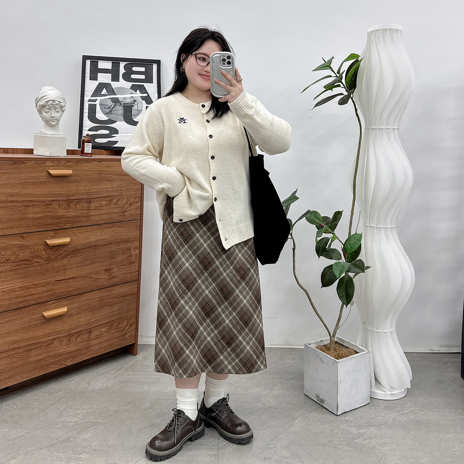 淘宝大码复古黑色格子毛呢半身裙女胖mm微胖秋冬高腰包臀a字格纹短裙