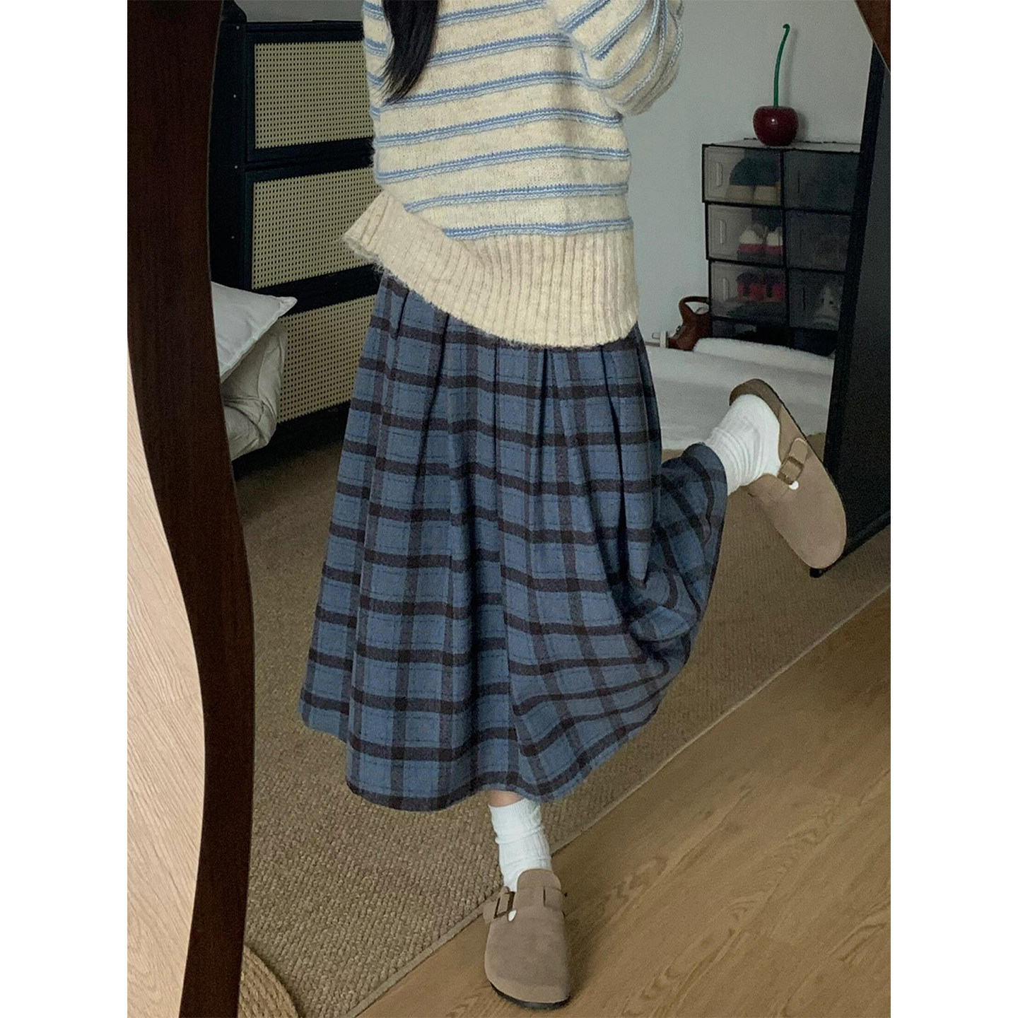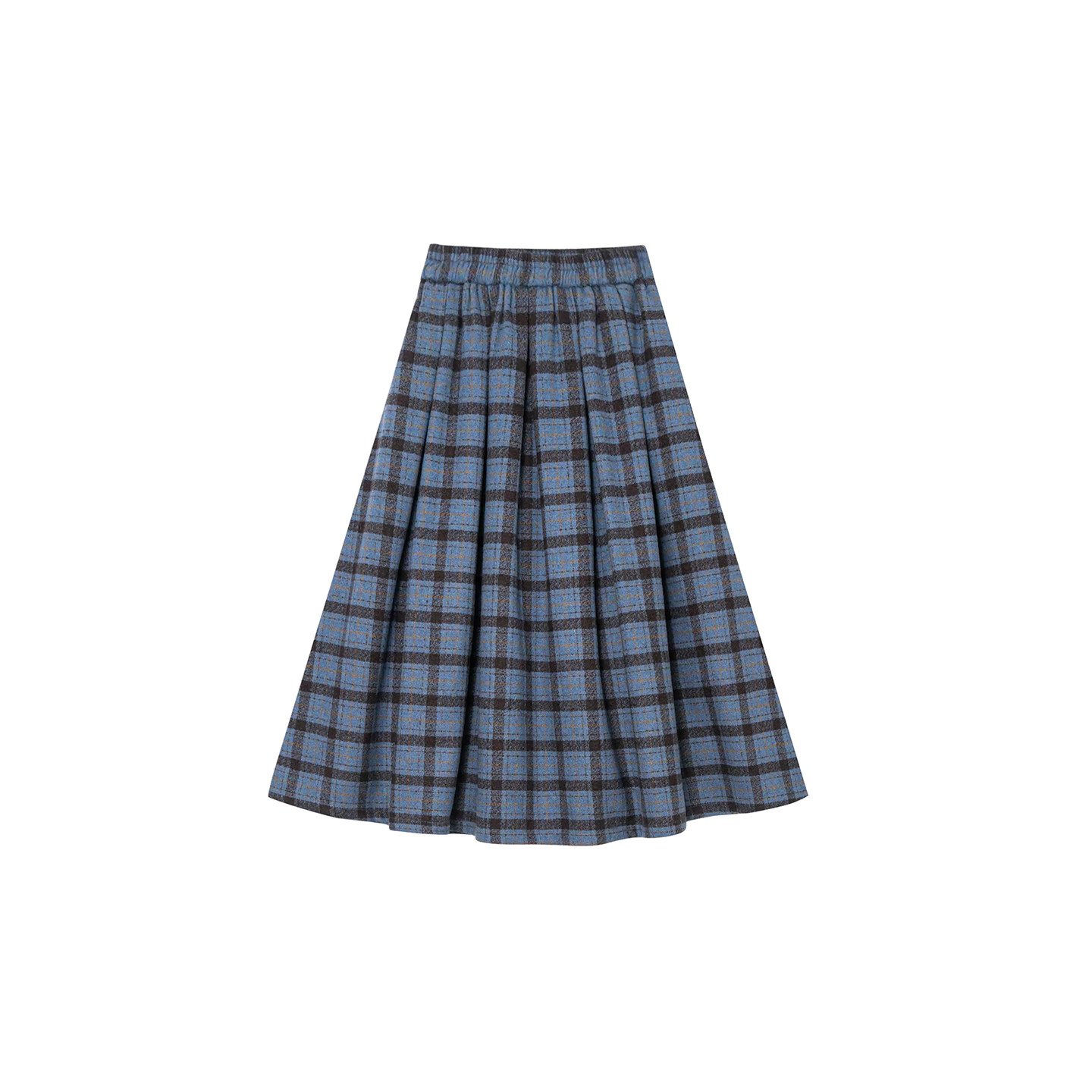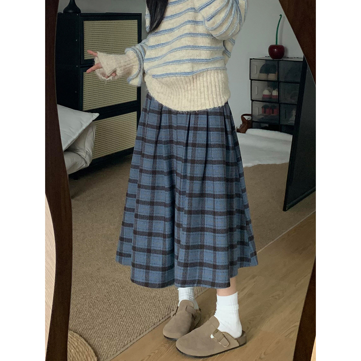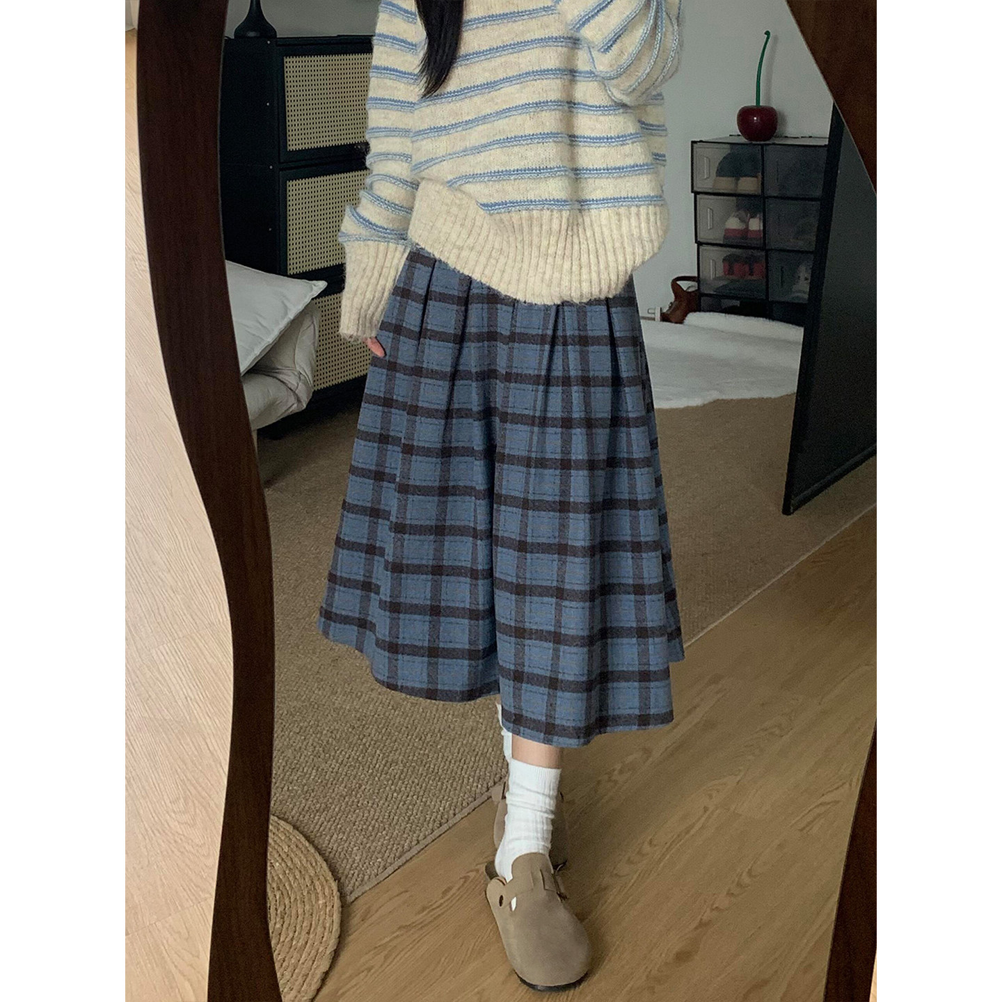 淘宝复古蓝色毛呢格子半身裙女秋冬新款胖妹妹mm高腰遮胯a字百褶长裙