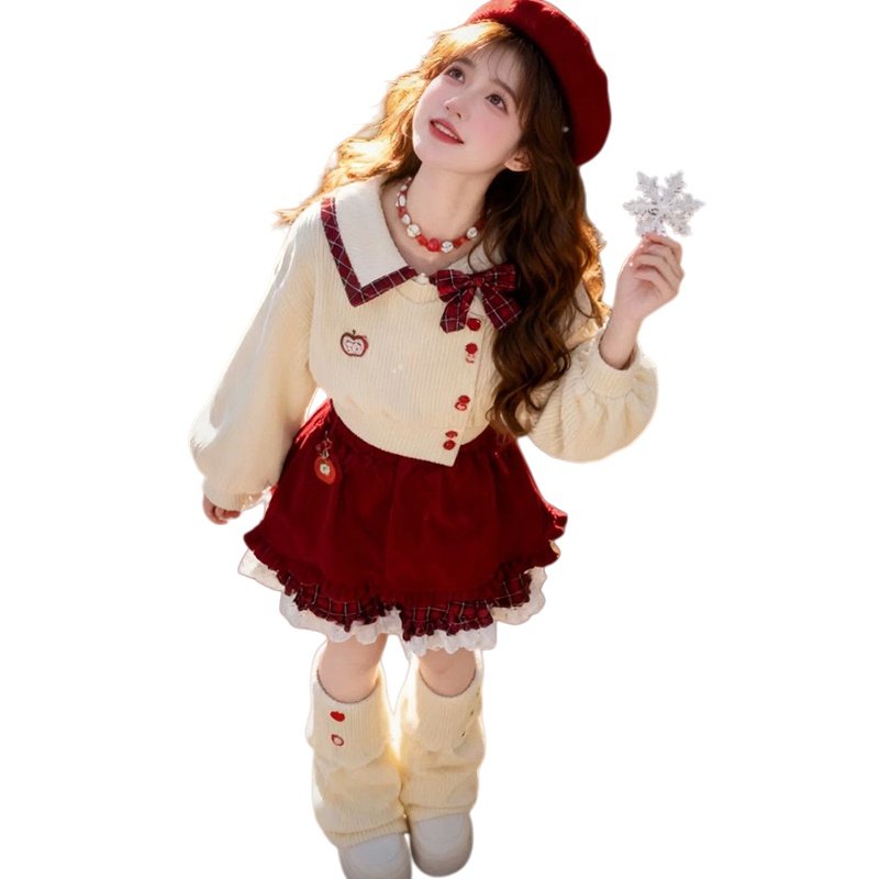 淘宝甜美少女风圣诞新年穿搭套装裙森女显瘦套头上衣+红色高腰半身裙