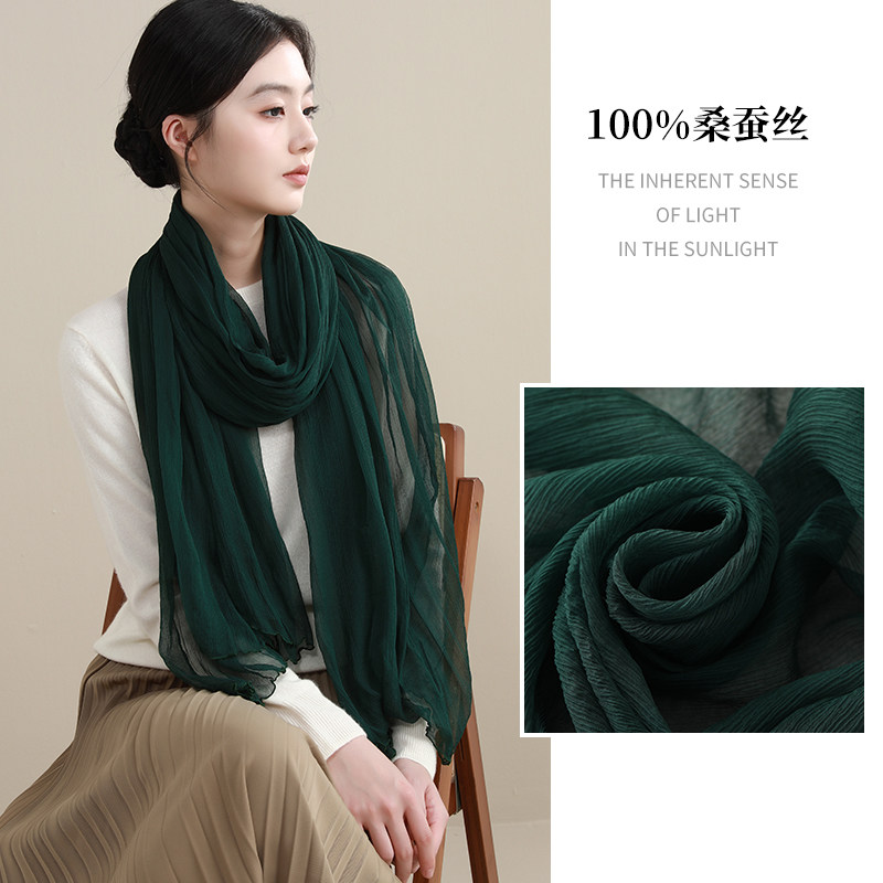全新推出的100%桑蚕丝顺纡皱长款真丝丝巾,精选优质桑蚕丝织造,触感柔滑亲肤,轻盈透气。独特的顺纡皱工艺赋予丝巾自然垂坠的肌理感,兼具飘逸与挺括,尽显雅致格调。长款设计巧妙,春秋可系于颈间增添优雅气质,冬季亦可作披肩保暖护颈,一物两用,实用百搭。无论是搭配大衣、毛衣还是裙装,都能轻松提升整体造型的高级感。色彩柔和,光泽温润,彰显东方女性的温婉与知性。这款丝巾不仅是时尚配饰,更是品质生活的象征,适合日常通勤、休闲出行或重要场合佩戴,尽显低调奢华之美。