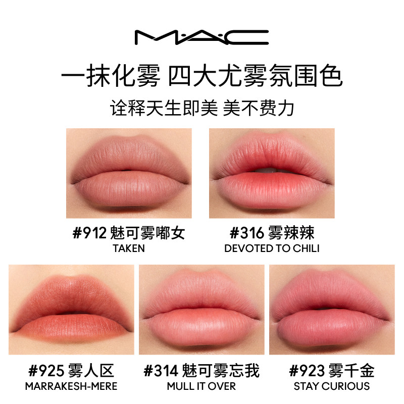 【李佳琦直播间时尚节】倾情呈现MAC/魅可轻尤雾弹唇膏系列,以一抹柔雾质感点亮双唇魅力。全新轻尤雾弹融合唇釉、唇泥与雾面唇膏三重优势,质地轻盈不拔干,延展顺滑,轻松打造高级哑光妆效。高显色配方一抹即显,持久锁色不沾杯,全天候绽放自信唇色。多色可选,从温柔豆沙到气场正红,满足不同场合与风格需求。在李佳琦直播间时尚节,限时优惠叠加惊喜赠品,让你以更优价格入手这款彩妆界新宠。无论是日常通勤还是约会派对,MAC轻尤雾弹都能助你轻松驾驭,尽显时尚态度与个性风采。