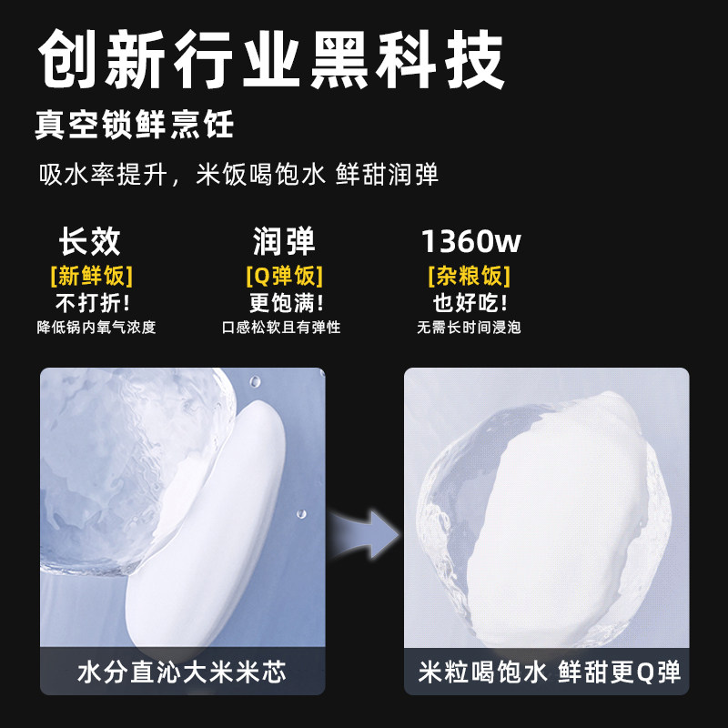 海尔IH真空保鲜电饭煲纯钛0涂层4L多功能家用电饭锅,专为3-4人家庭设计,集高效烹饪与食材保鲜于一体。采用IH立体加热技术,实现均匀受热,米饭口感香甜松软。内胆为纯钛材质,0涂层设计,健康安全,耐用不脱落。创新真空保鲜功能,有效锁住食材水分与营养,延长保鲜时间。4L精致容量,适合小家庭日常使用,迷你机身节省厨房空间。支持多种烹饪模式,煮饭、煲汤、蒸煮、杂粮饭等一锅搞定,操作简便智能。兼具美观与实用,是现代健康厨房的理想选择。