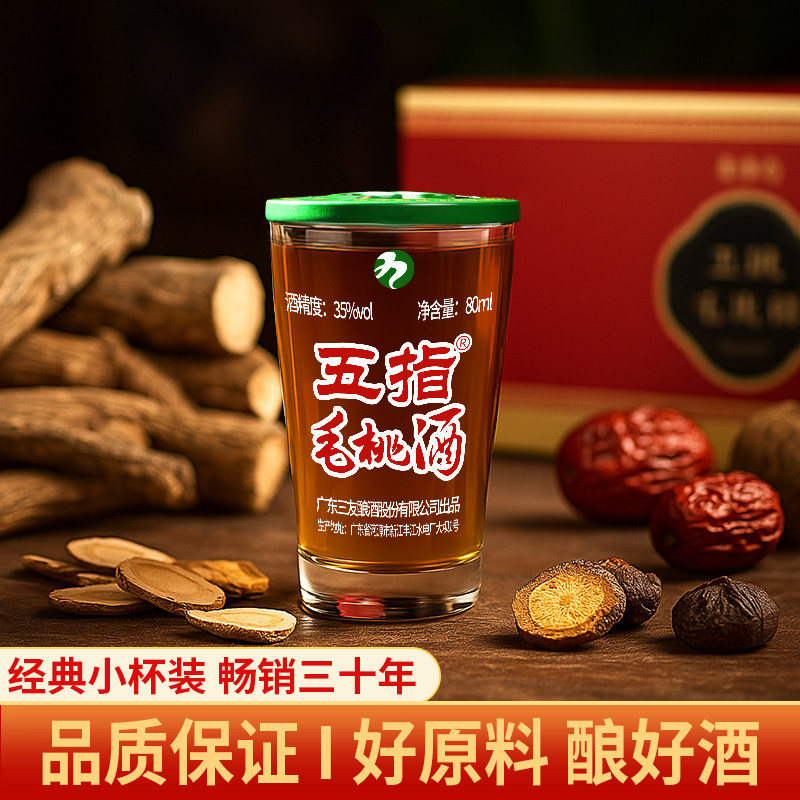 五指毛桃枸杞养生酒是一款融合传统中医理念的植物露酒,精选优质纯粮基酒,配以五指毛桃、枸杞等天然草本精华,经科学配比、古法酿制而成。酒体醇厚,香气清雅,35度适中酒精度,既保留药材滋补功效,又口感柔和易饮。五指毛桃健脾补肺、祛湿舒筋,枸杞滋补肝肾、益精明目,二者协同增强免疫力,适合日常养生保健。80ML精致杯装设计,便携卫生,适合居家、办公或旅行饮用。本品属植物类露酒,非药品,建议适量饮用,尤适宜亚健康人群及注重养生的中老年人。坚持适量饮用,助力健康生活。
