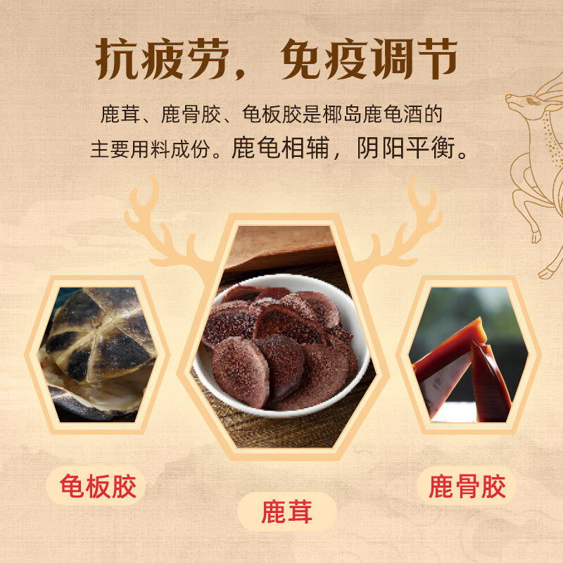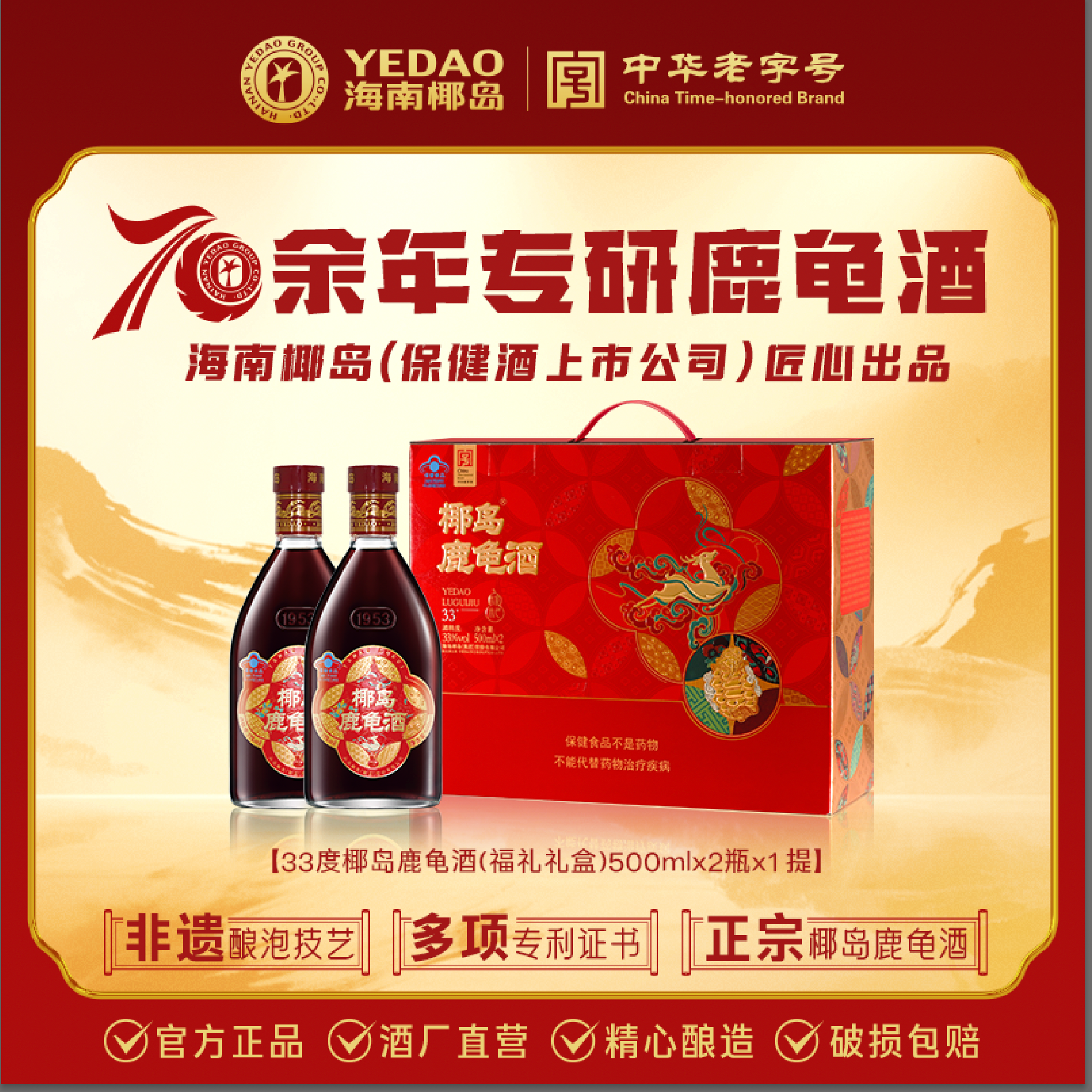 椰岛鹿龟酒经典版,33度500ml装,是一款专为保健养生打造的优质礼盒酒。精选优质原料,融合传统酿造工艺与现代科技,酒体醇厚,口感温润,蕴含鹿茸、龟板胶等珍贵滋补成分,有助于增强体质、调节免疫,特别适合中老年人日常调养。低度设计更易入口,饮用无负担。精美礼盒包装,寓意健康长寿,是春节馈赠父母的贴心之选。自营品质保障,正品承诺,让孝心更有保障。无论是自用还是送礼,椰岛鹿龟酒都是传递关爱、表达孝心的理想年货佳品,让父母在佳节中感受温暖与健康。