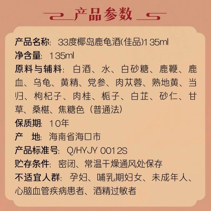 【年货好礼】椰岛鹿龟酒(佳品)33度135ml,精选优质原料,融合传统养生智慧与现代工艺,酒体醇厚、口感温润,富含多种滋补成分,温和调养,适合中老年人日常饮用。低度设计更易入口,135ml精致小瓶装,方便携带,是春节走亲访友、孝敬父母的贴心之选。包装典雅大气,寓意健康长寿,传递浓浓情意。无论是自用还是作为伴手礼,椰岛鹿龟酒都彰显心意与品位,让关爱在醇香中流淌,为团圆佳节增添一份健康祝福。送健康,就选椰岛鹿龟酒,让爱更有“礼”。
