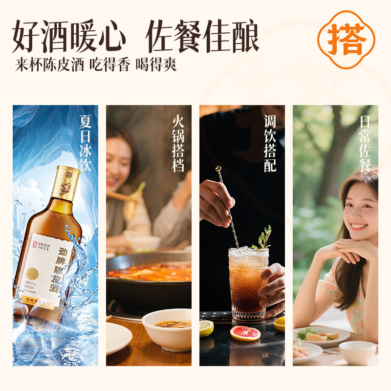 【正品酒水】劲牌陈皮酒,精选优质基酒与陈年陈皮精心调配,酒体醇厚,香气清雅,40度适中酒精度,既保留传统劲酒特色,又融入陈皮独特养生功效。玻璃瓶精装,质感通透,彰显品质。适合亲友聚会、佳节宴请或日常养生饮用,入口绵柔,回味甘甜,兼具风味与健康。作为敬酒佳品,寓意吉祥如意、健康长寿。劲牌品牌保障,正品承诺,让您喝得放心、送得有面。无论是自饮还是馈赠亲友,劲牌陈皮酒都是融合传统工艺与现代健康的理想选择,让每一口都饱含温情与关怀。