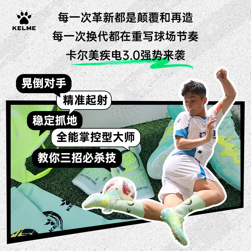 卡尔美疾电3足球鞋是一款专为青少年及成人设计的专业训练用鞋,采用TF碎钉(Turf)与MG多地形鞋底配置,适配人造草、短天然草等多种场地,提供出色抓地力与稳定性。鞋面运用轻量化合成材料,兼顾包裹性与透气性,有效提升触球感与舒适度。前掌搭载疾速推进科技,助力快速启动与变向,适合日常训练与校园比赛。男女同款设计,简约时尚,兼顾性能与颜值。正品保障,耐磨防滑,是儿童、青少年及成人足球爱好者提升表现的理想选择。