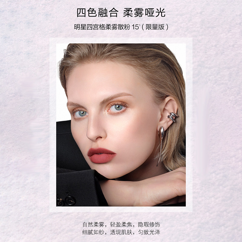 Givenchy纪梵希四宫格柔雾散粉15(限量版)以卓越工艺融合四重色调,打造自然柔焦妆效。粉质极致细腻轻盈,如薄雾般贴合肌肤,有效隐匿毛孔与细纹,呈现高级哑光质感。独特的“柔雾微粒”技术,可智能调节光线反射,令肤色匀净通透,持久控油不卡粉。限量版包装延续品牌经典美学,优雅黑色搭配金色细节,彰显奢华格调。无论是日常通勤或重要场合,这款散粉都能为底妆增添精致与高级感,是追求完美妆效女性的理想之选,展现法式优雅与现代风尚的完美融合。
