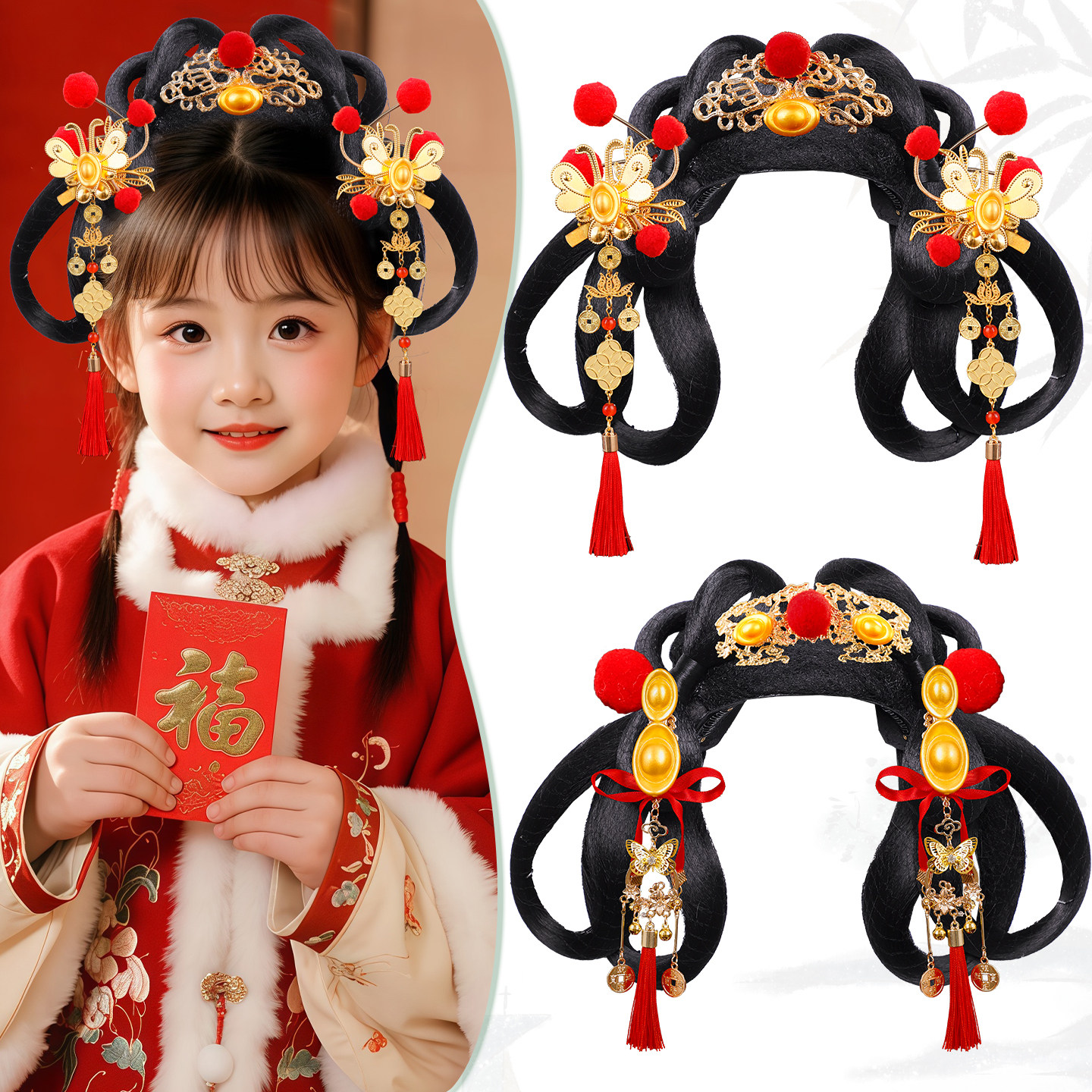新年喜庆可爱少女造型假发头饰套装搭配古风汉服发髻抱面发排组合