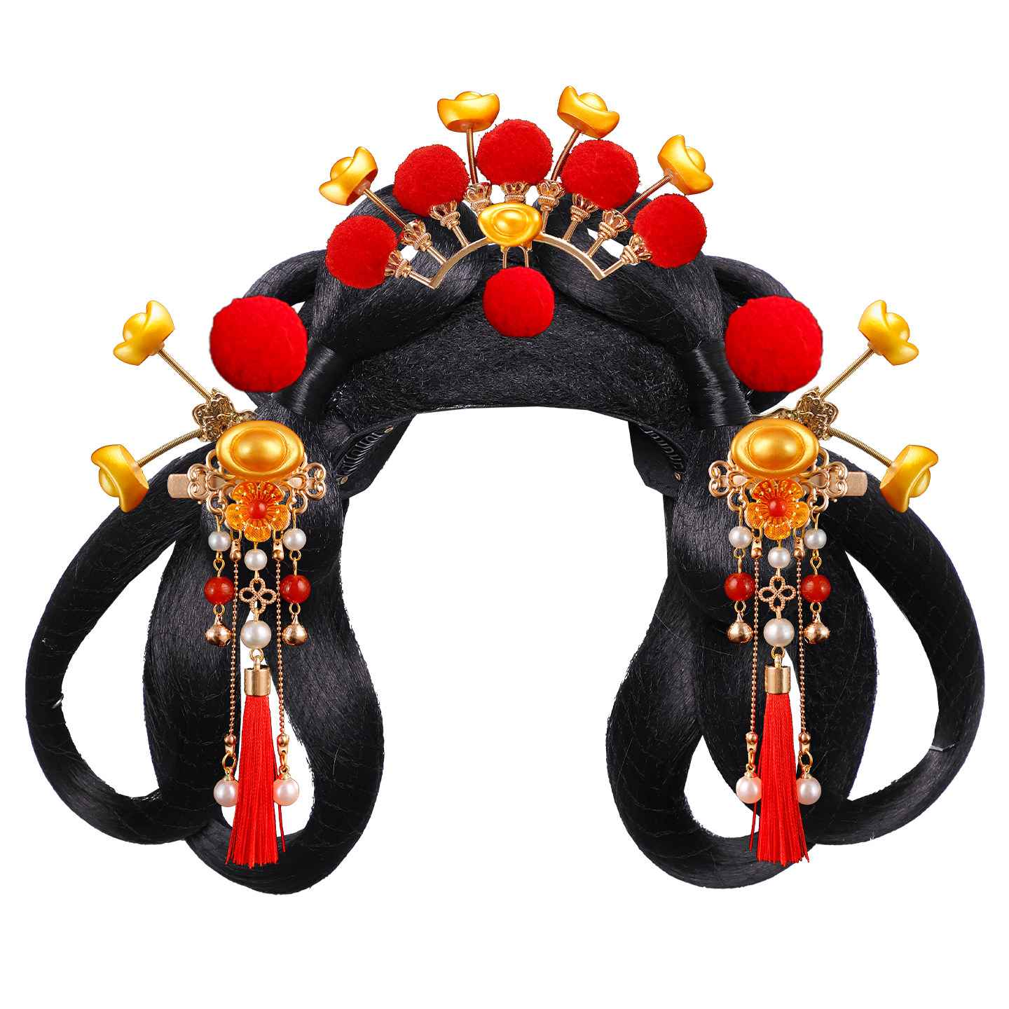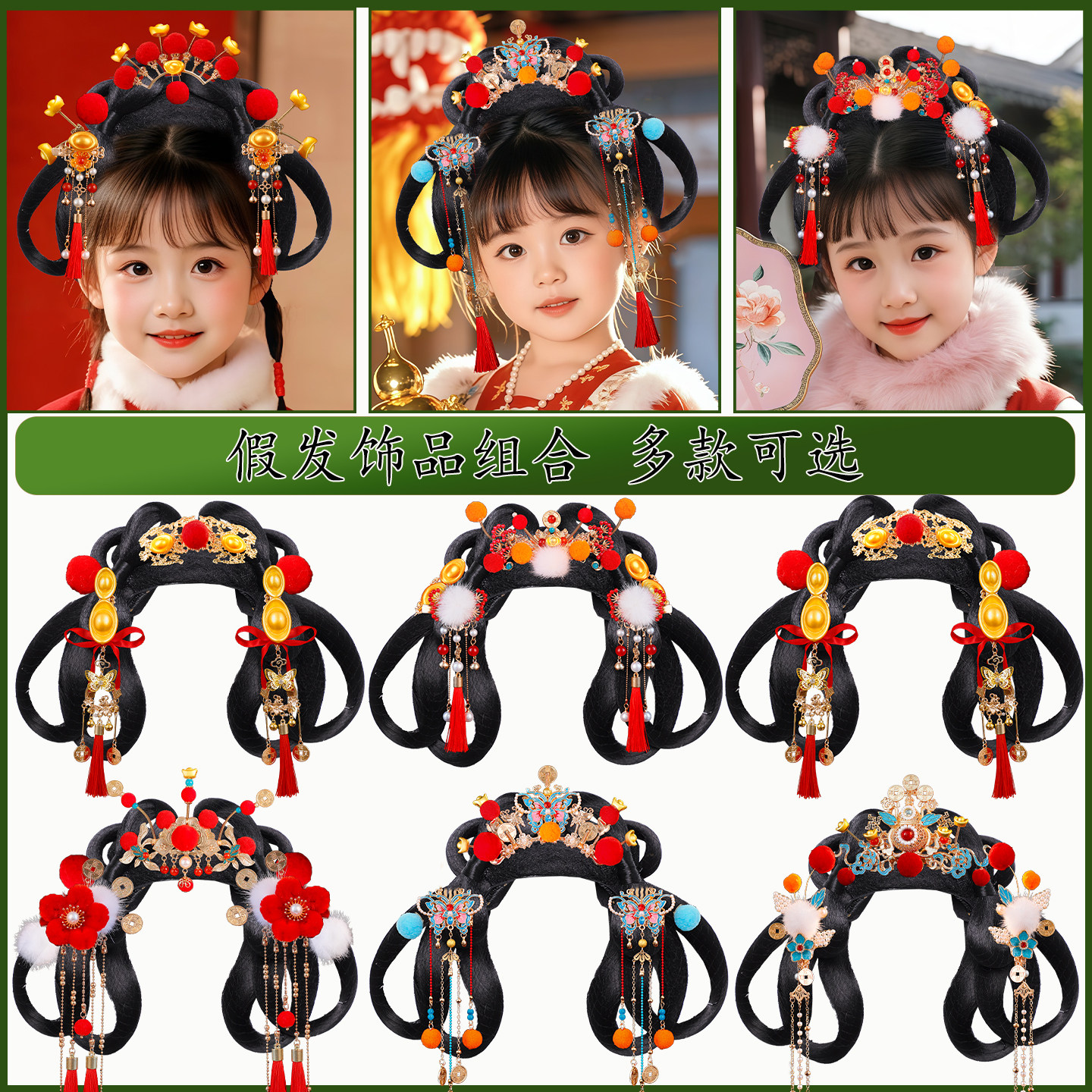 淘宝儿童假发饰品组合古装新年毛球发夹发冠cos小财神妆造全套头饰