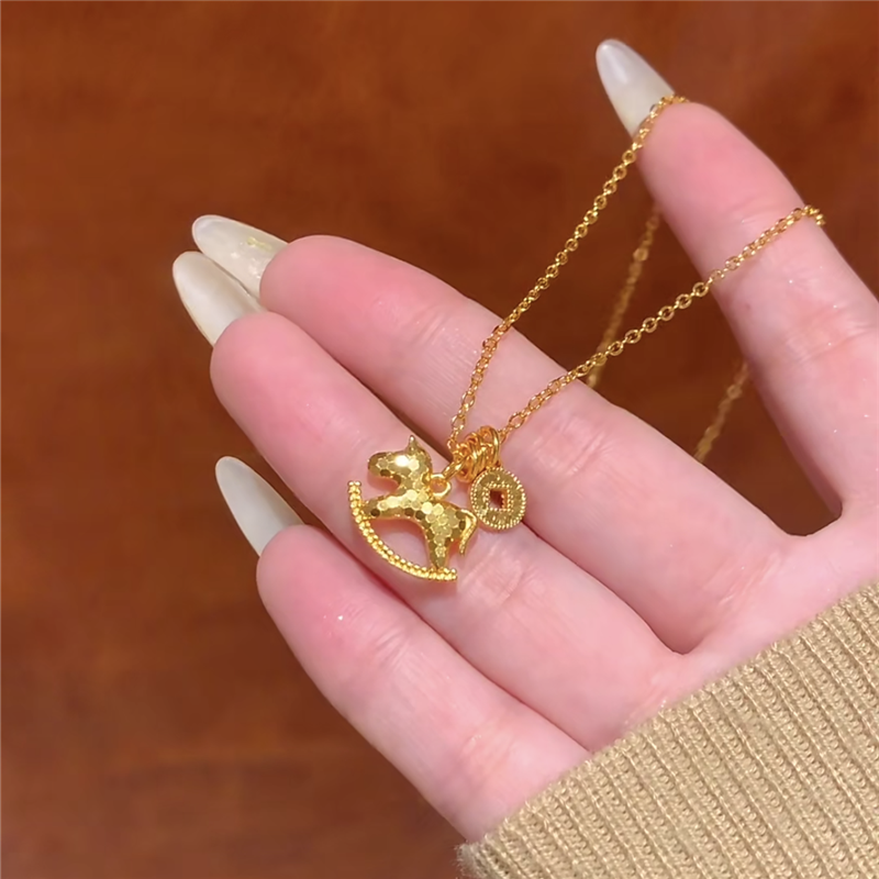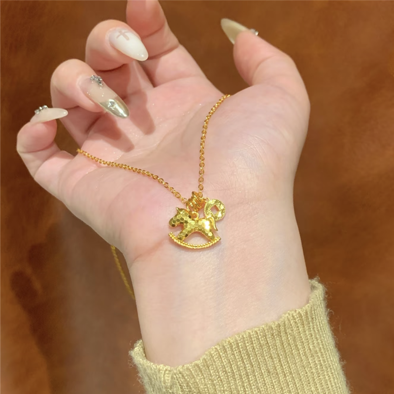 【马上来财】仿黄金色太闪碎碎冰摇摇马吊坠项链,以精致小巧的摇摇马造型为核心,镶嵌闪耀碎钻般“碎碎冰”元素,在光线下折射出璀璨光芒,尽显轻奢质感。吊坠巧妙融合传统钱币元素,寓意“马上来财”,寄托美好祝愿。采用仿黄金色调,复古又时尚,搭配纤细锁骨链设计,轻盈贴合颈部曲线,凸显女性优雅气质。无论是日常搭配还是节日佩戴,都能成为吸睛亮点。这款小马钱币锁骨链,既是时尚配饰,也是承载好运的精致礼物,适合自戴或赠予亲友,传递财运与祝福。