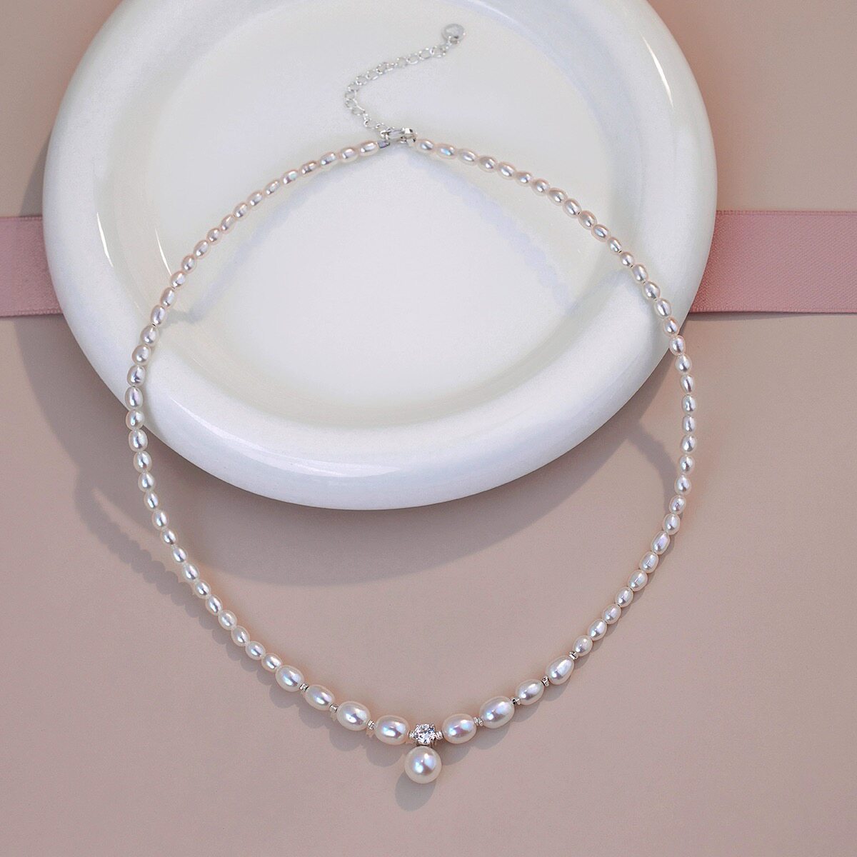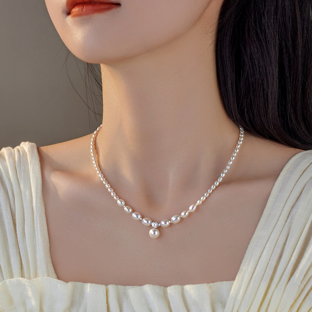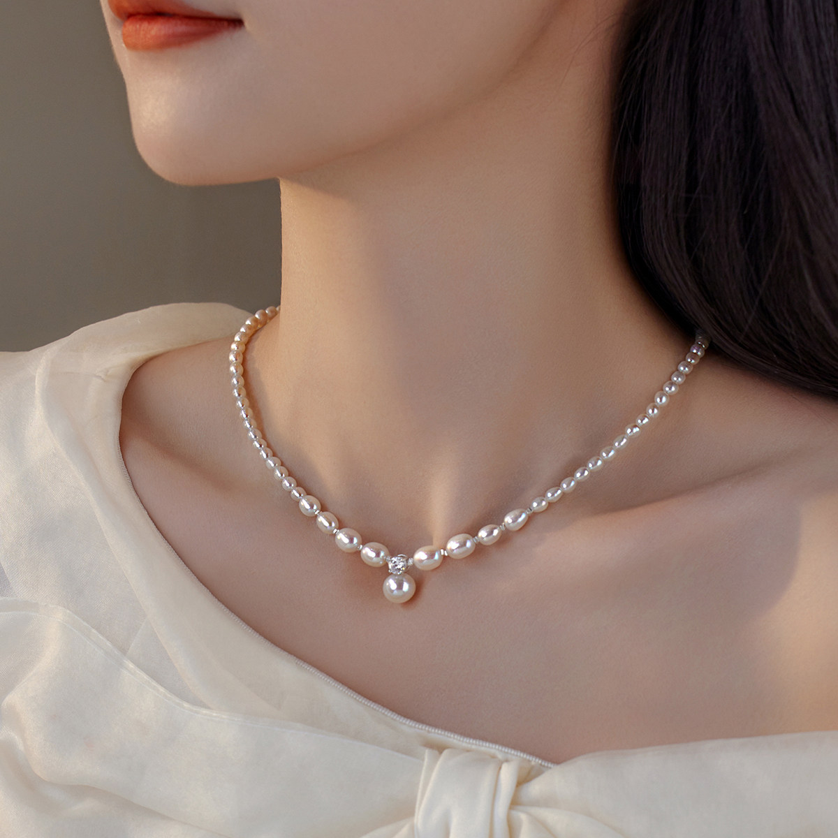 淘宝原创设计戴妃款渐变米形强光天然淡水珍珠S925纯银碎银子气质项链