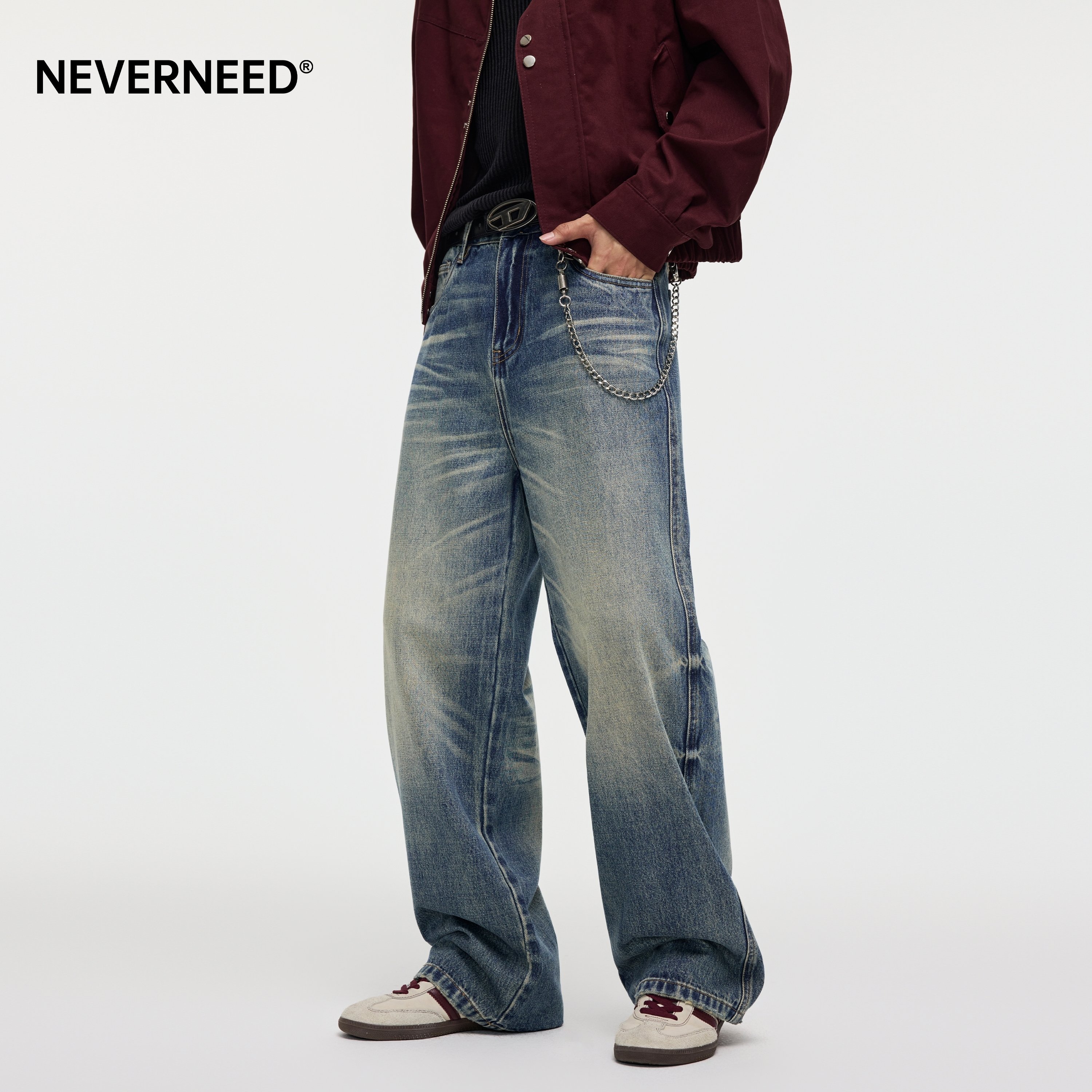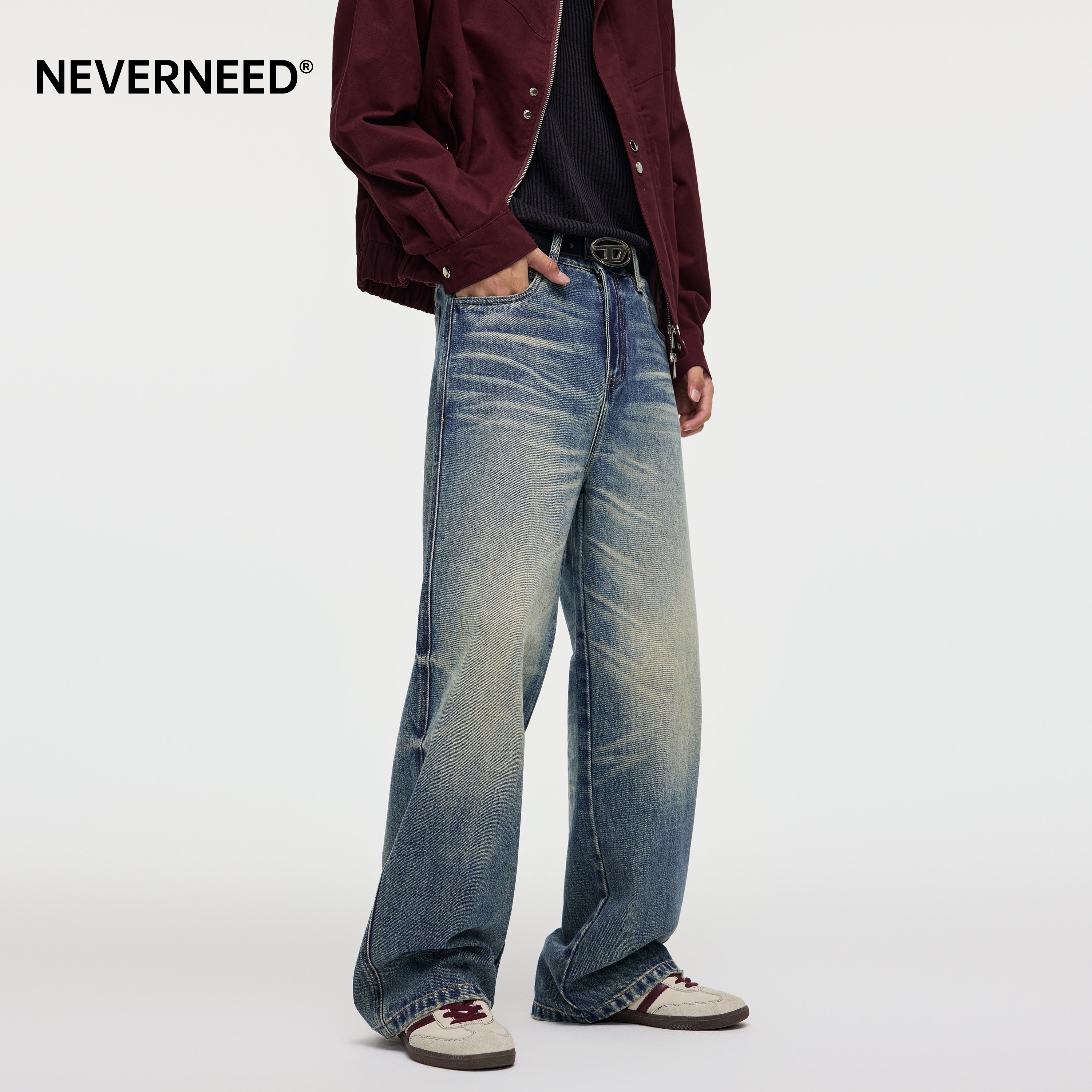 淘宝NEVERNEED美式高街立体猫须牛仔裤男女秋季水洗做旧战斗牛王A字裤