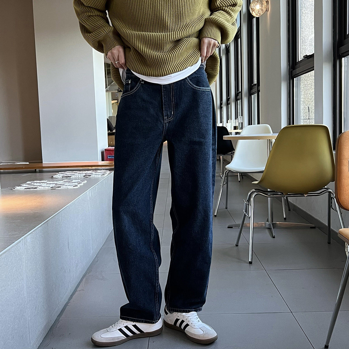 Nick Tian 深蓝色直筒牛仔裤男冬季新款厚款宽松休闲长裤
