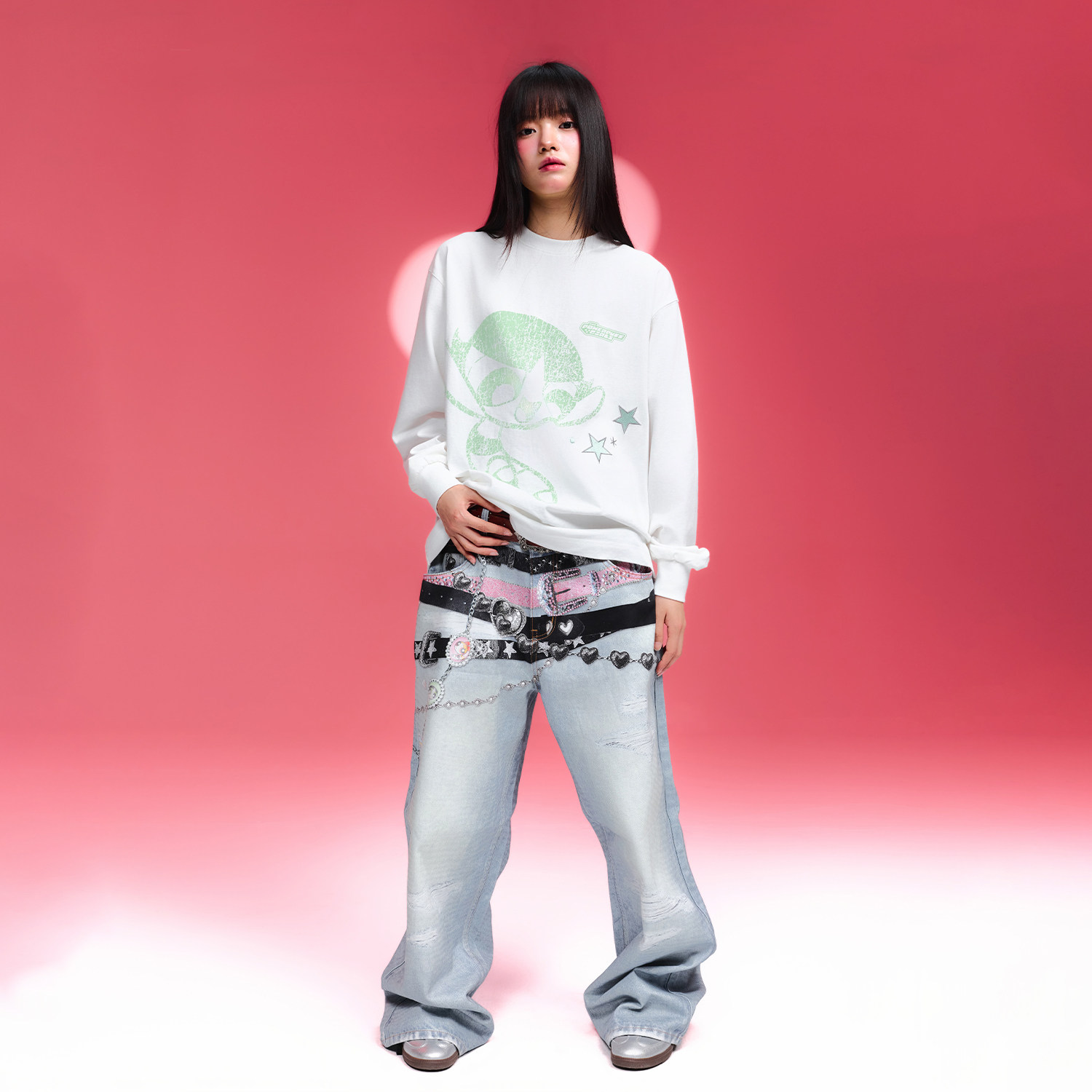 【飞天小女警联名】WHOOSIS秋冬美式街头宽松牛仔裤,以经典卡通IP为灵感,融合复古潮流与舒适实穿。采用高克重水洗牛仔布,质感挺括,做旧工艺彰显个性。宽松直筒剪裁,男女同款,轻松驾驭街头随性风格。高腰设计拉长腿部线条,侧边飞天小女警印花细节俏皮吸睛,裤脚微喇处理增添复古韵味。无论是搭配卫衣、夹克还是短款上衣,都能打造活力满满的秋冬造型。兼具童趣与潮流感,是追求个性与舒适并存的时尚之选,让童年回忆与街头态度完美碰撞。